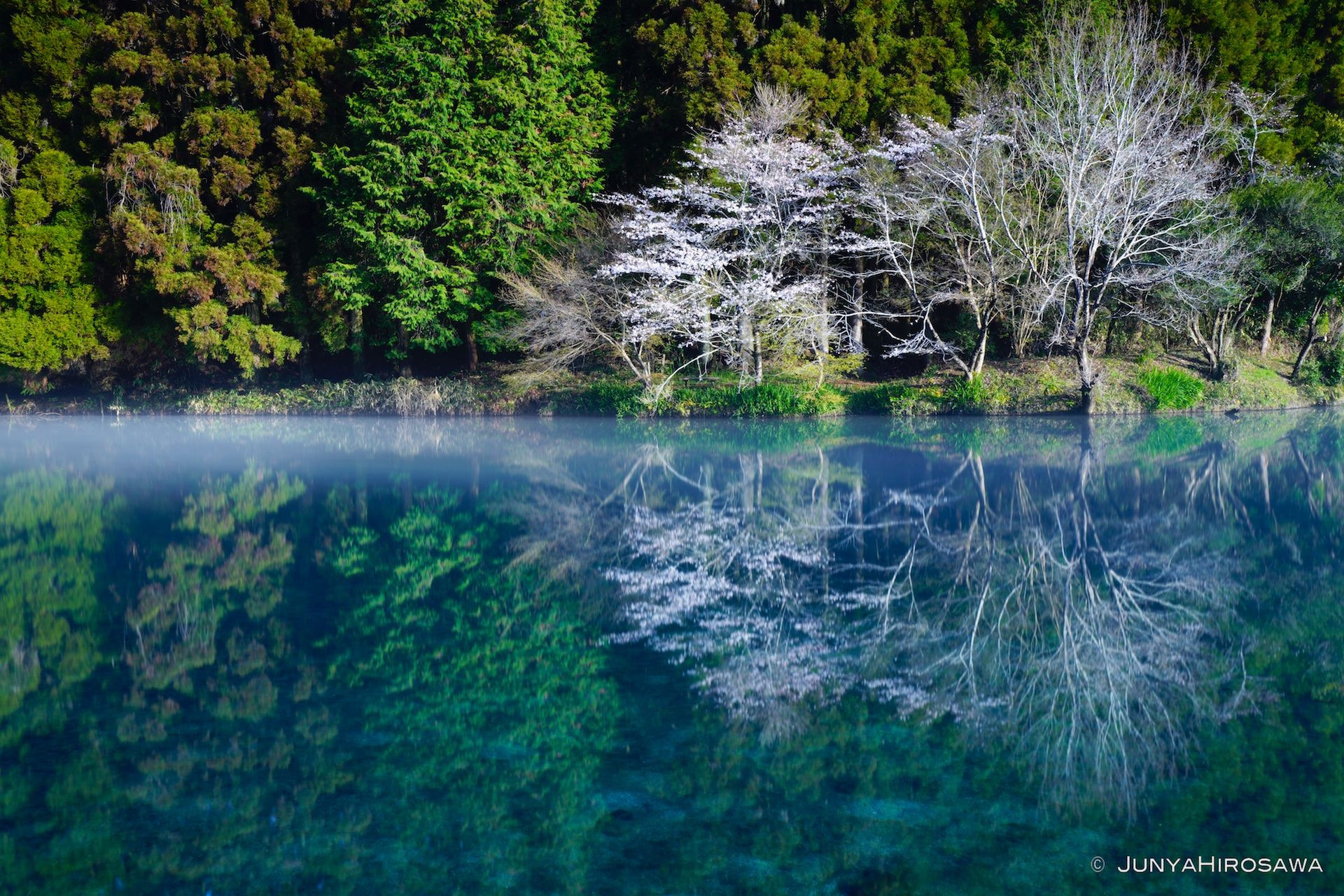 宮崎県と鹿児島県にまたがる霧島山に降った雨は、長い時を経て、麓に湧水となって湧き出す。 そんな湧水池の一つに咲く、2本の桜。朝の光が当たり始めた本物の桜と水鏡の桜。風がなく静寂な時が流れていた。