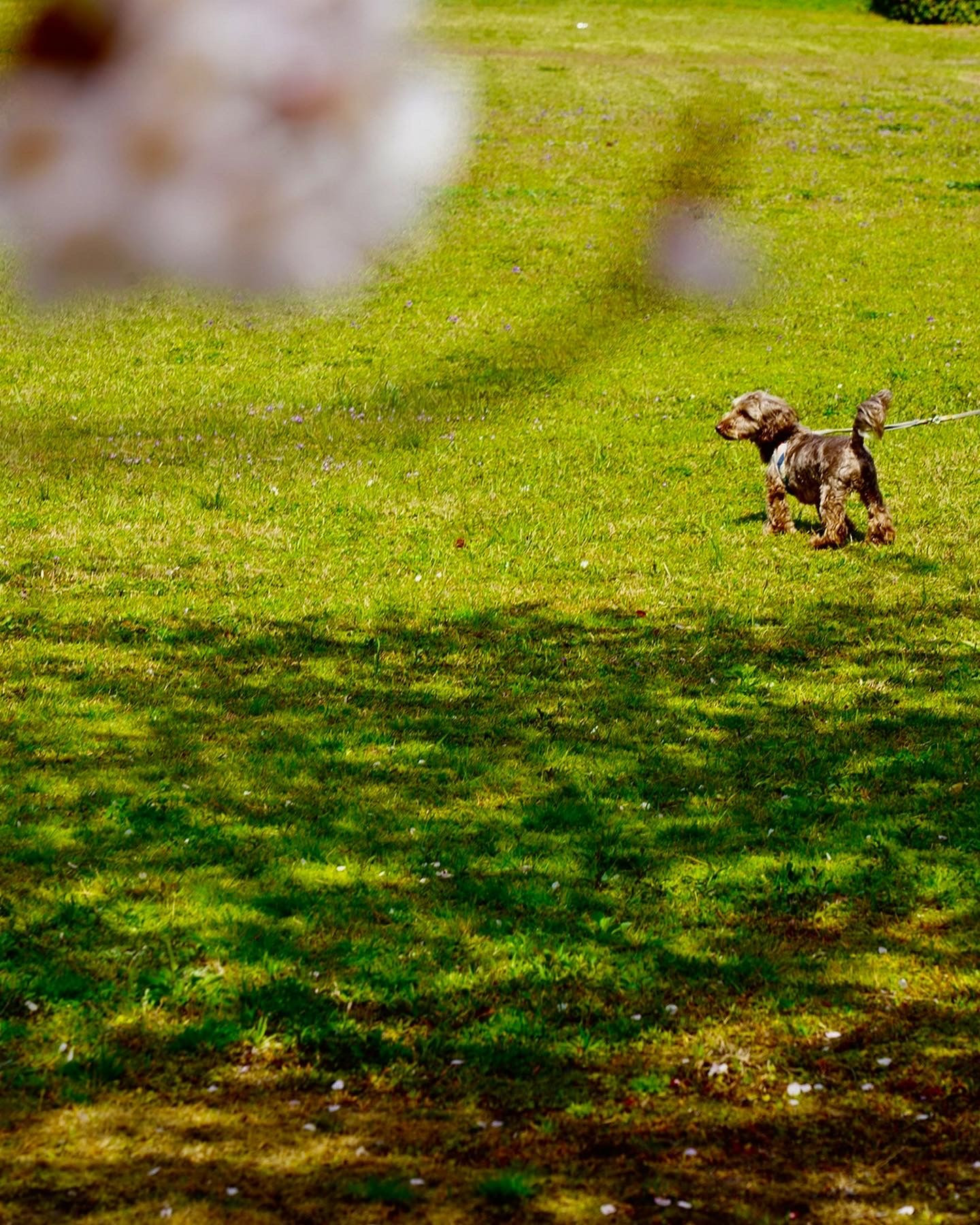 本当はリードを外して欲しい…という心の声が聞こえてきそうなワンちゃん 桜の花の下を自由に駆け回りたそうでした。