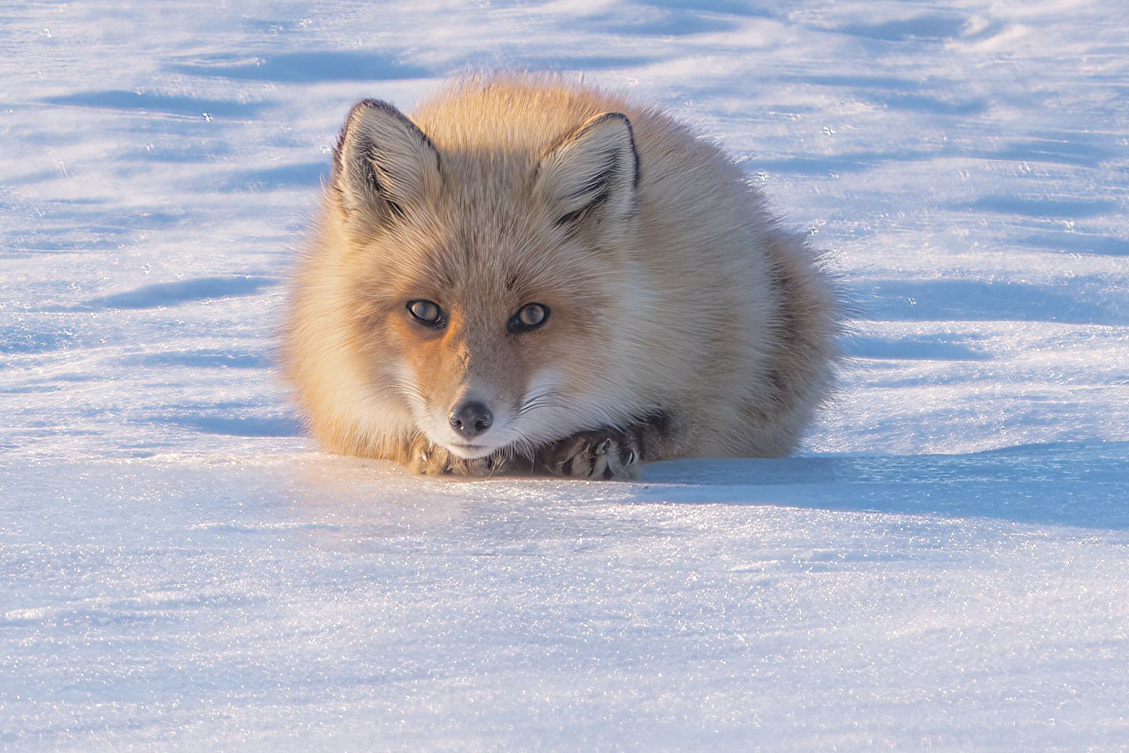 雪面を走る一頭の狐さんをカメラで追いかけていました。 急にうずくまってこちらをじっと見つめてくれましたが。。警戒されてますね;;