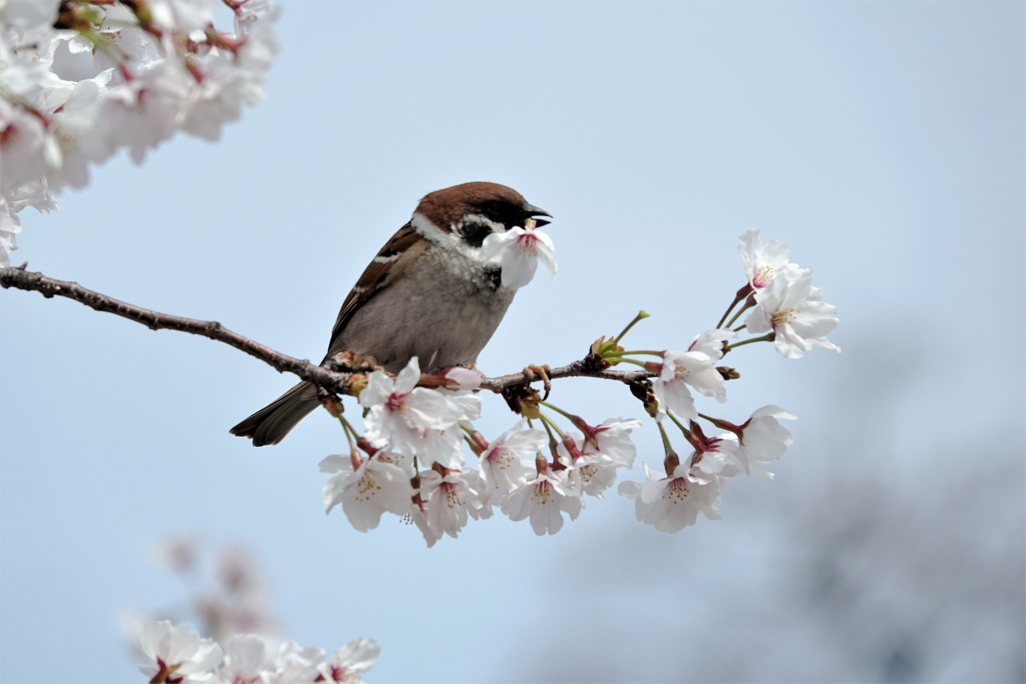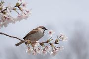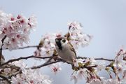 満開になったサクラに#スズメ#が集まり吸蜜していました。
