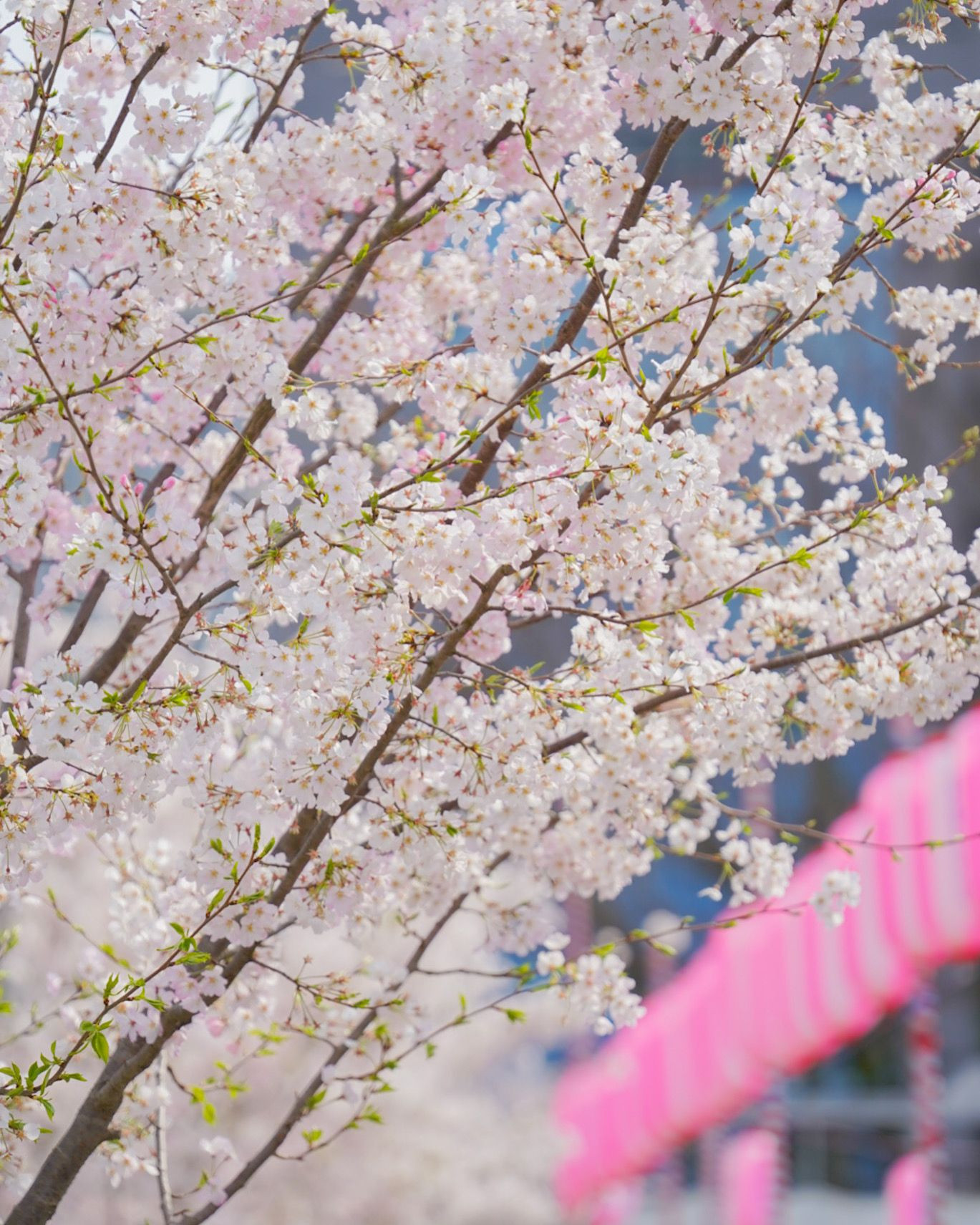 祭り提灯と、桜のピンクのコントラストが綺麗でした(^^)