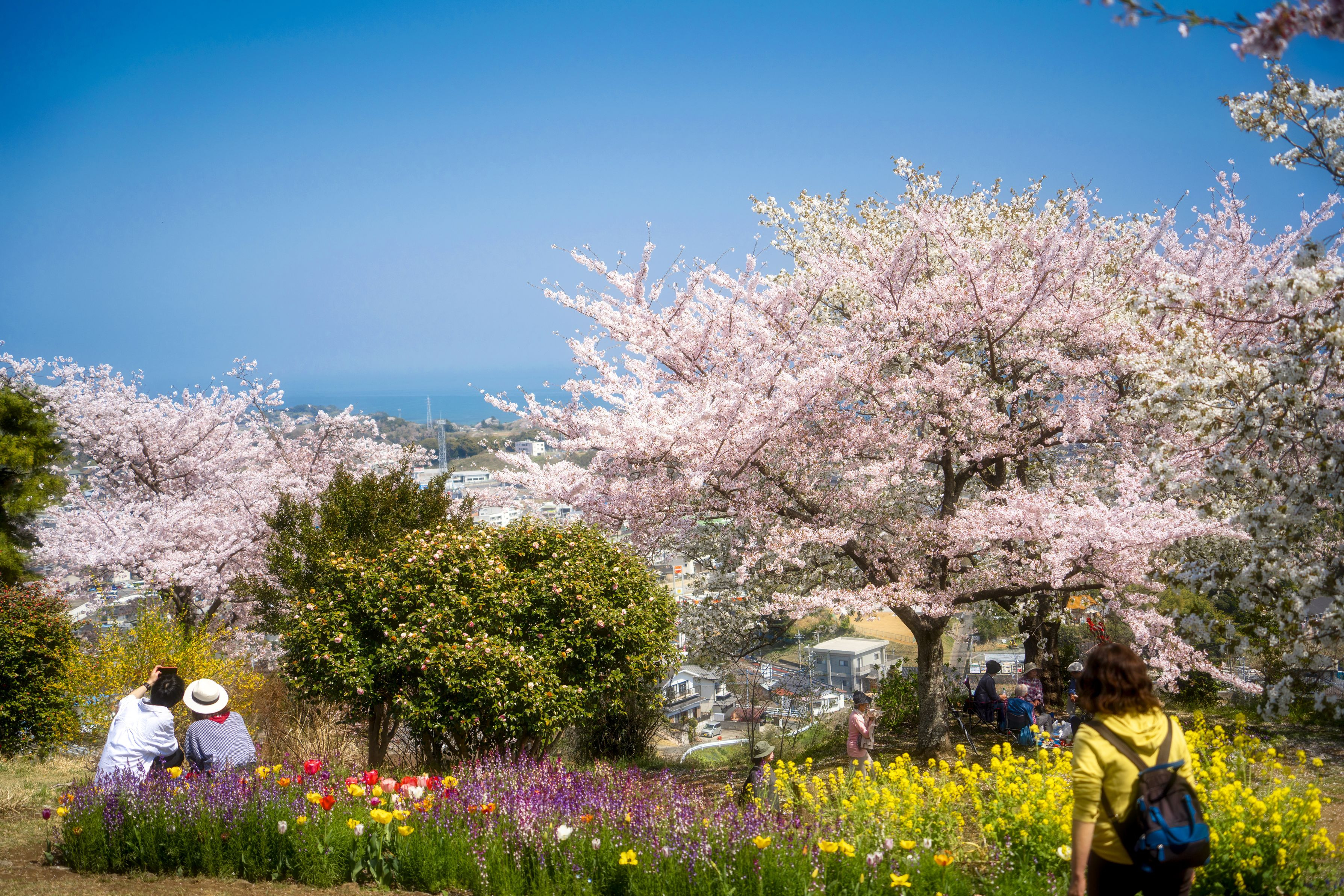 近所の丘です。 桜も花も海も無料で見放題('◇')ゞ