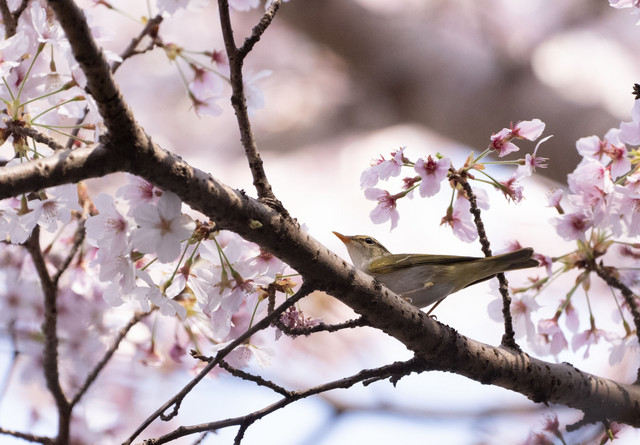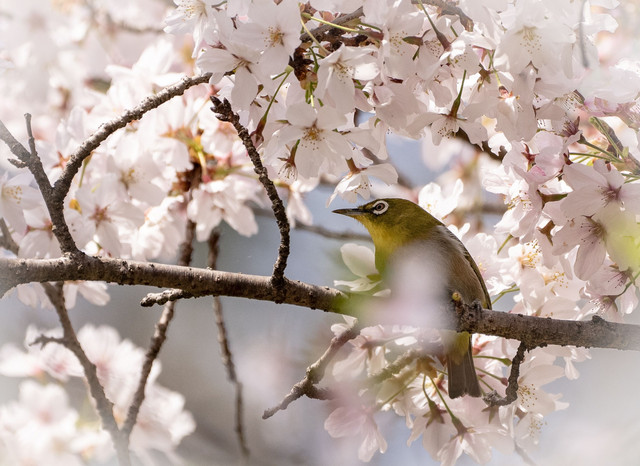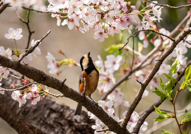 満開の桜に見とれる小鳥たち