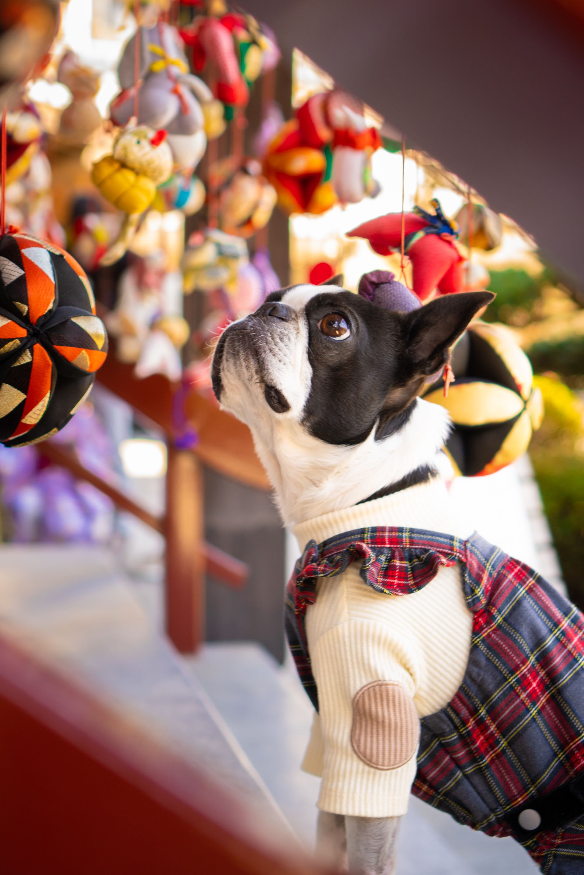 近所のお寺に吊るし雛を見に行きました。愛犬エースは、おもちゃみたいな吊るし雛に興味津々!