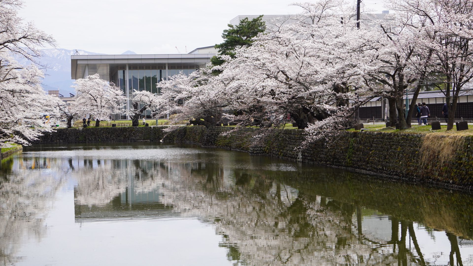 上杉神社のお堀で撮影した写真です。水面にうつる桜も綺麗に咲いていました。