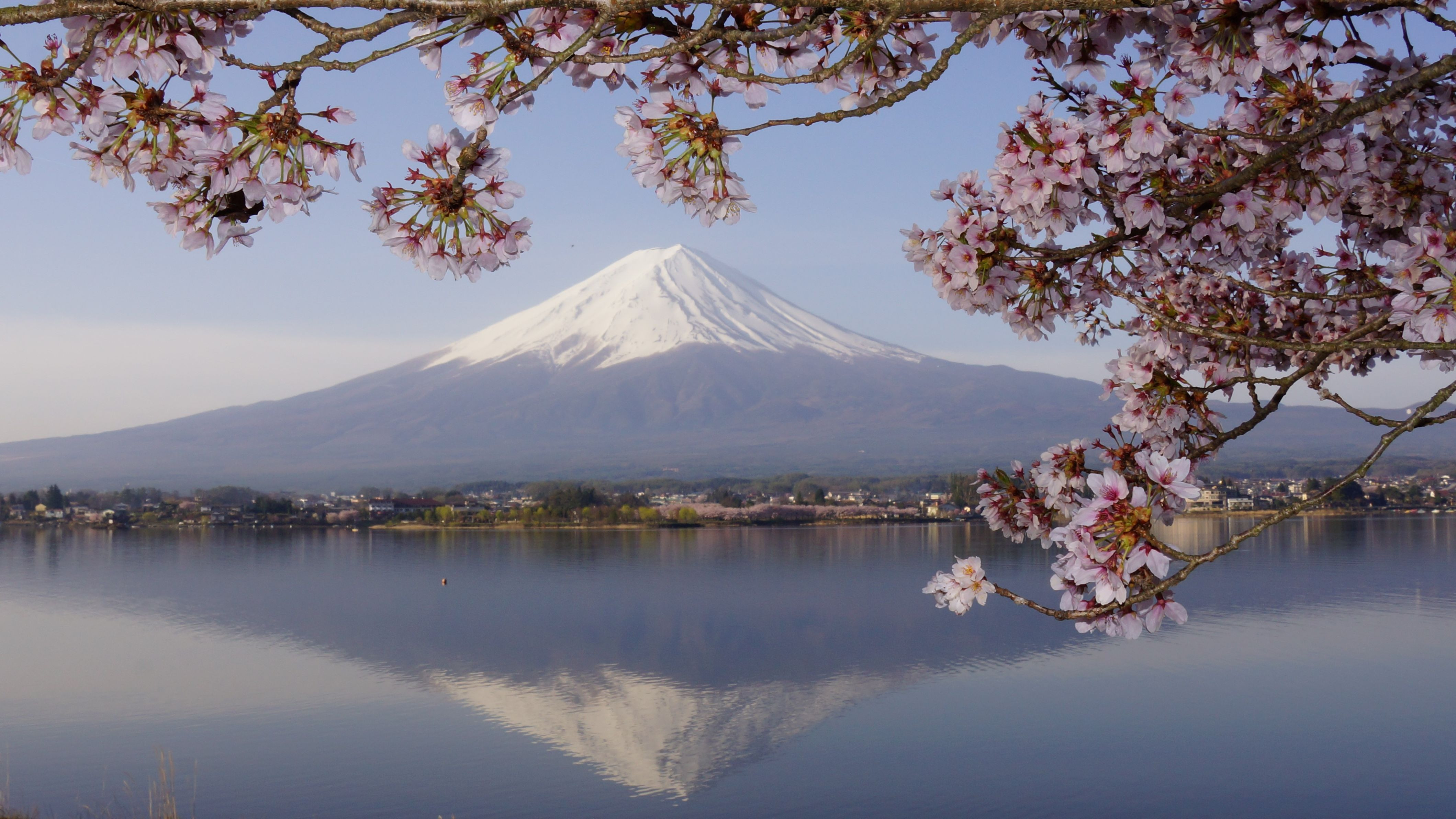 春浅い河口湖の北岸、風がやんでやっと湖面に写る富士山が撮れました。