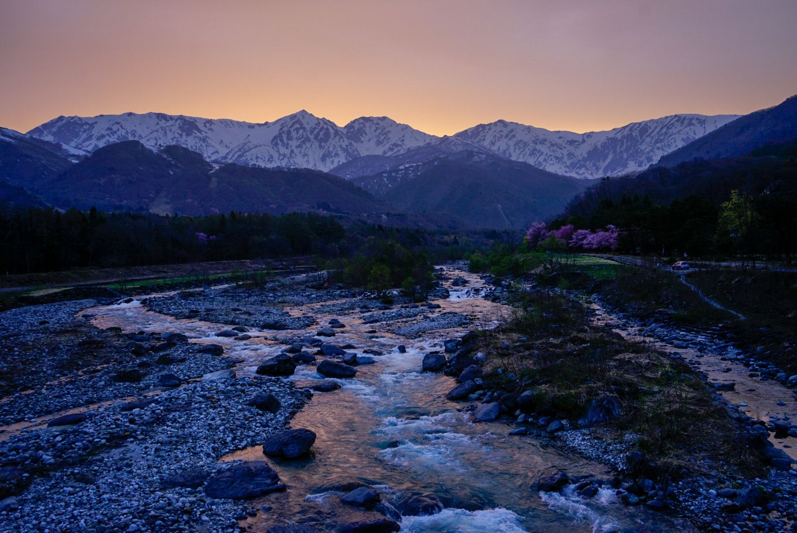 1日曇り空だったけど夕方になり雲が晴れ、桜と残雪の山がキレイでした。