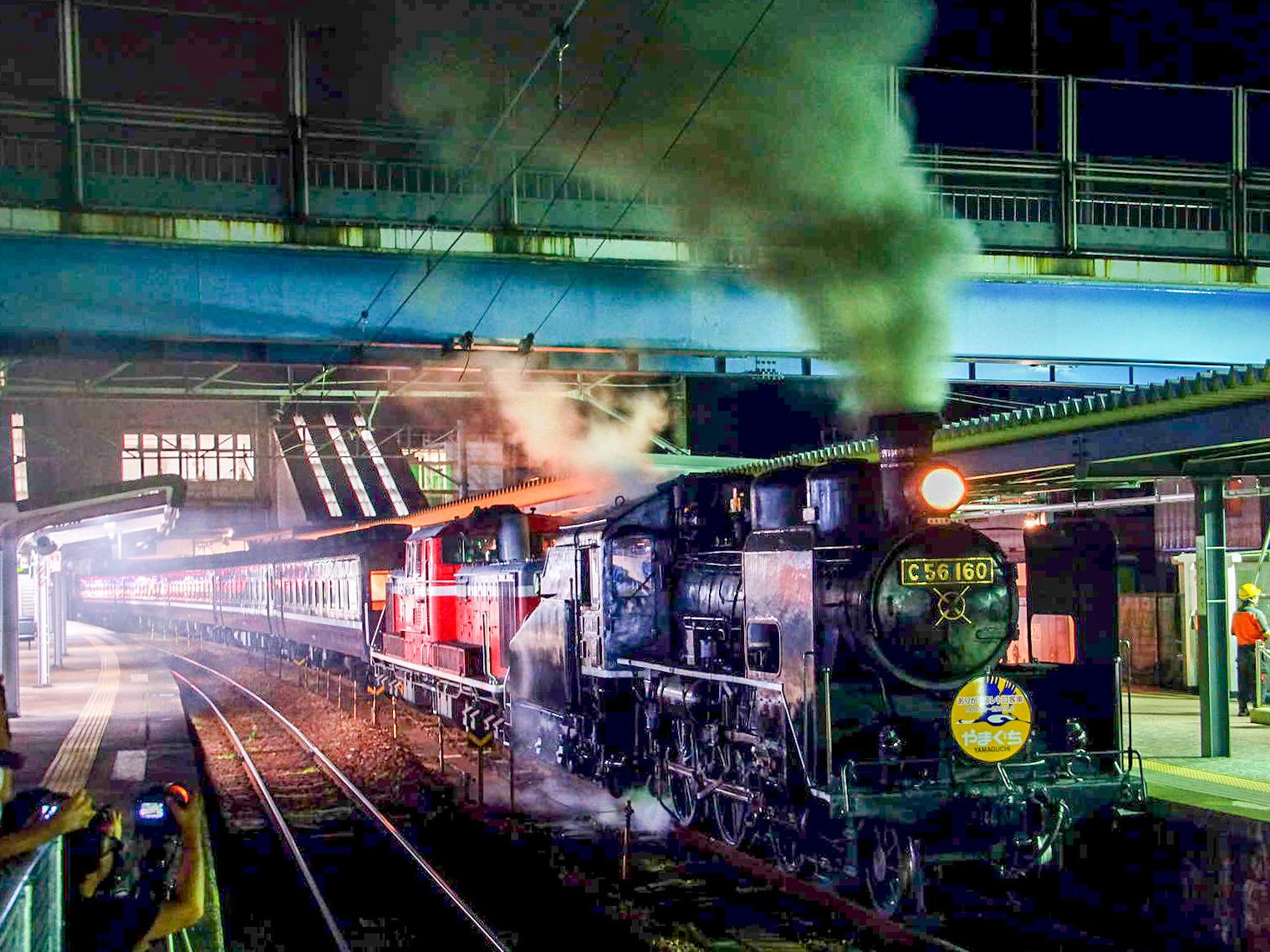 まだ日も登らぬ午前4時、この日山口線を離れるC56と12系客車が最後の下り路の発車を待つ