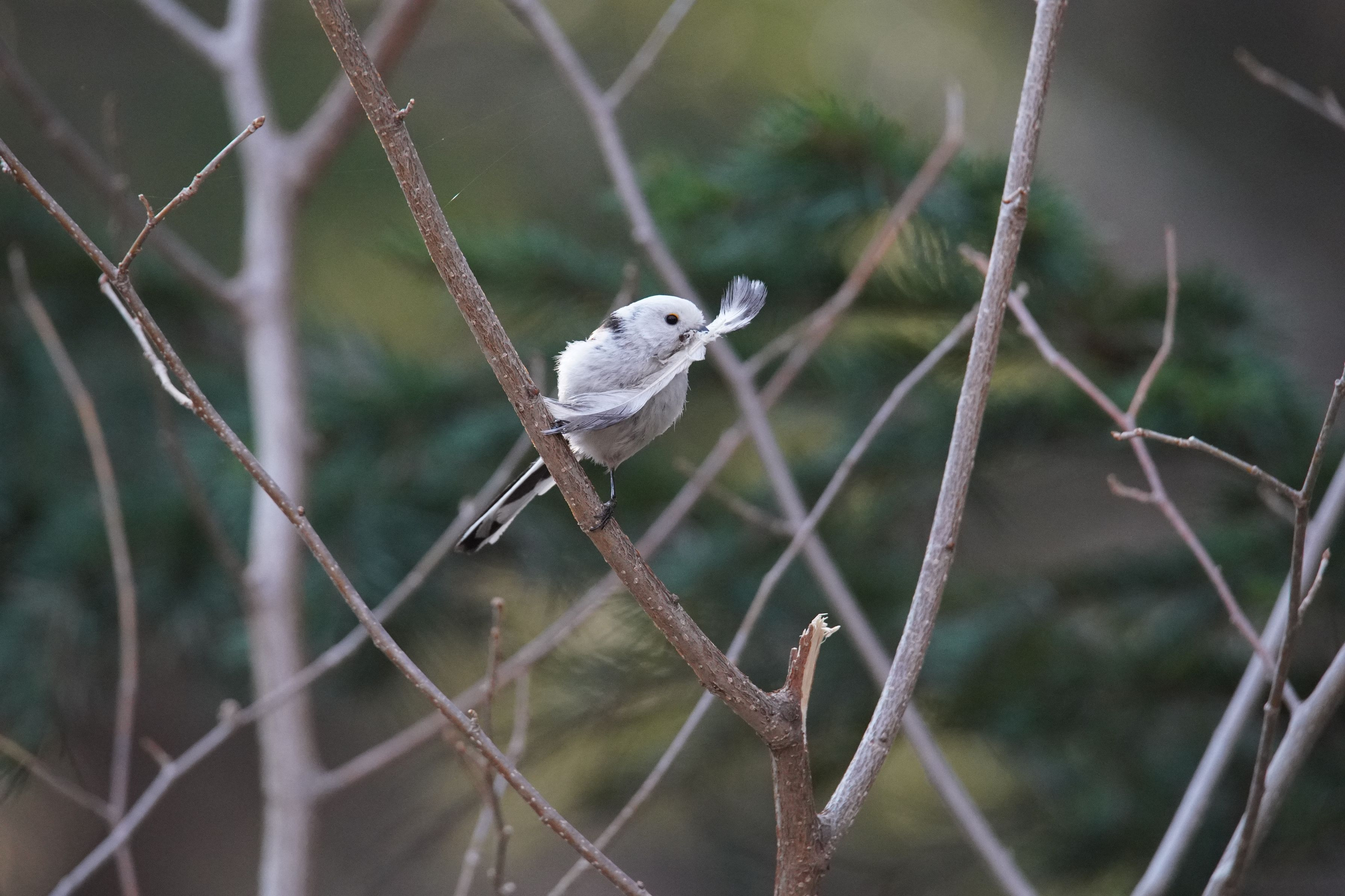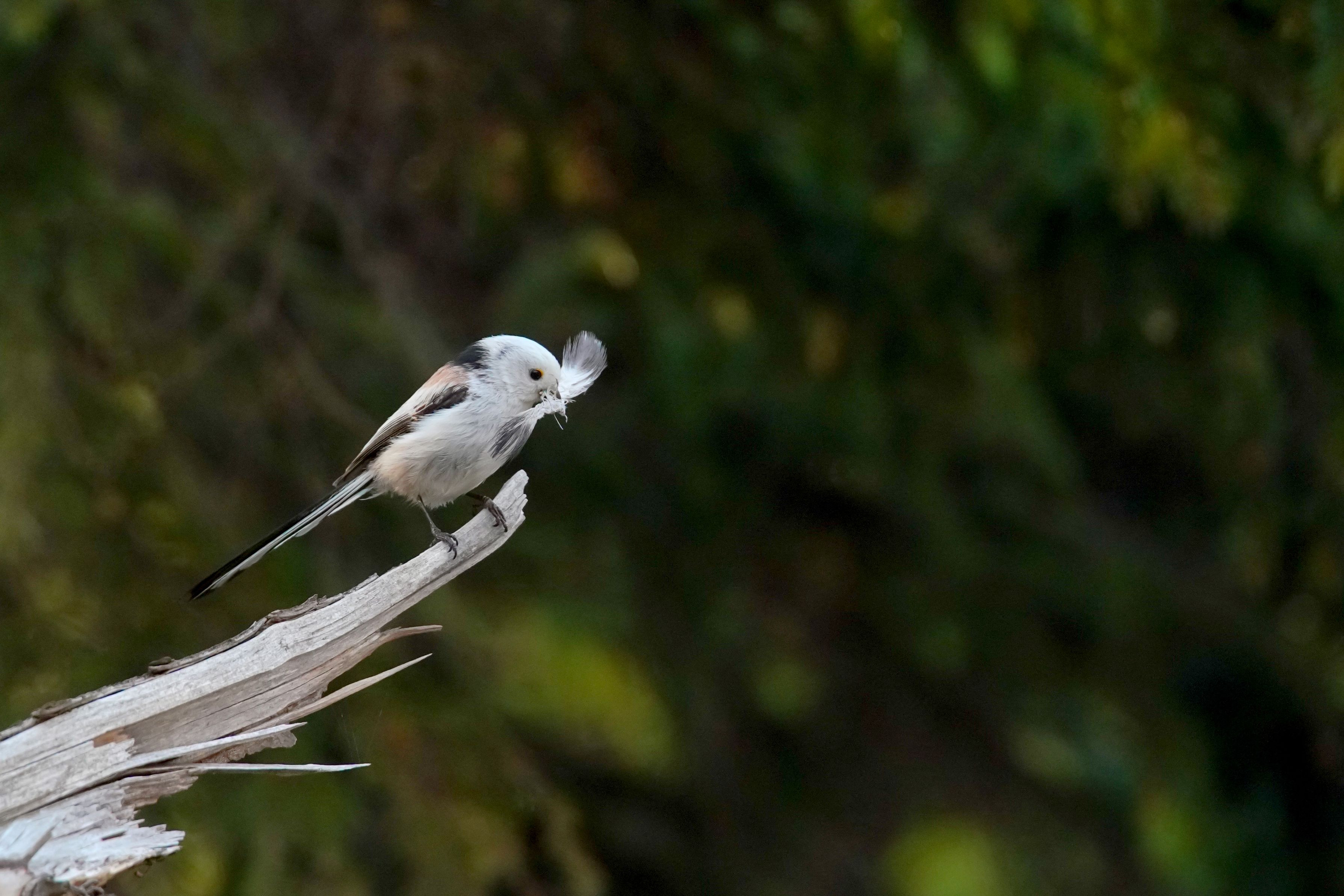 エナガが大きな羽をくわえて巣に持ち帰ろうとしていましたが、大きすぎたのか途中で落としていました。