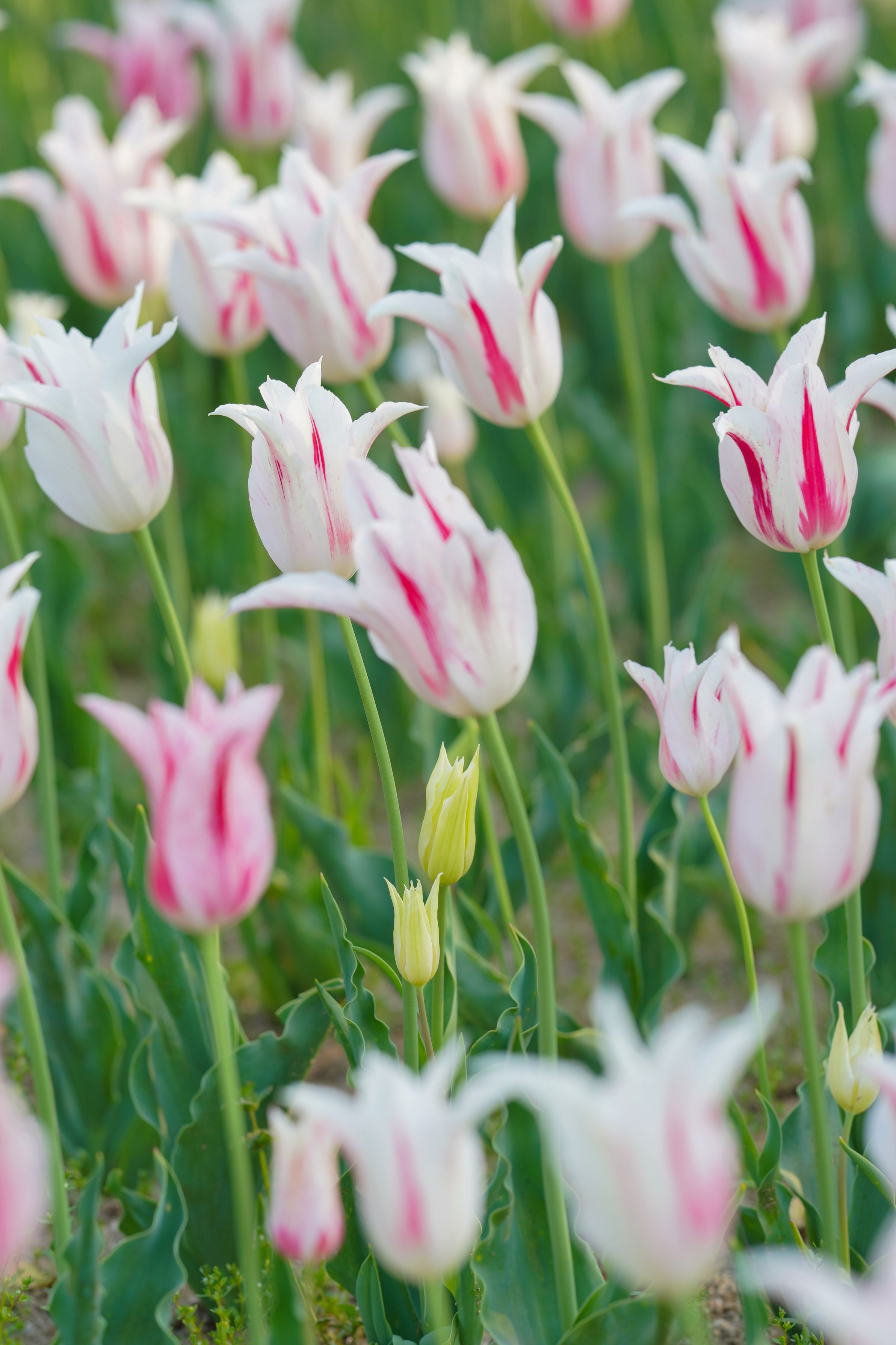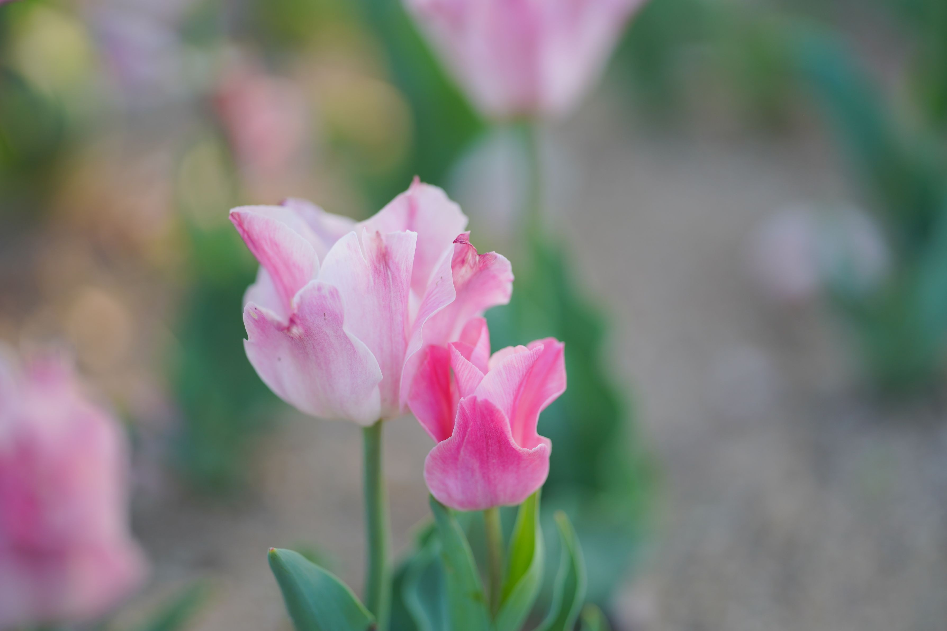 今年のチューリップ畑では、ぴったりくっついているペアを多く見かけました。偶然なのか、そうなるように植えてあったのか? 心和む出会いでした。