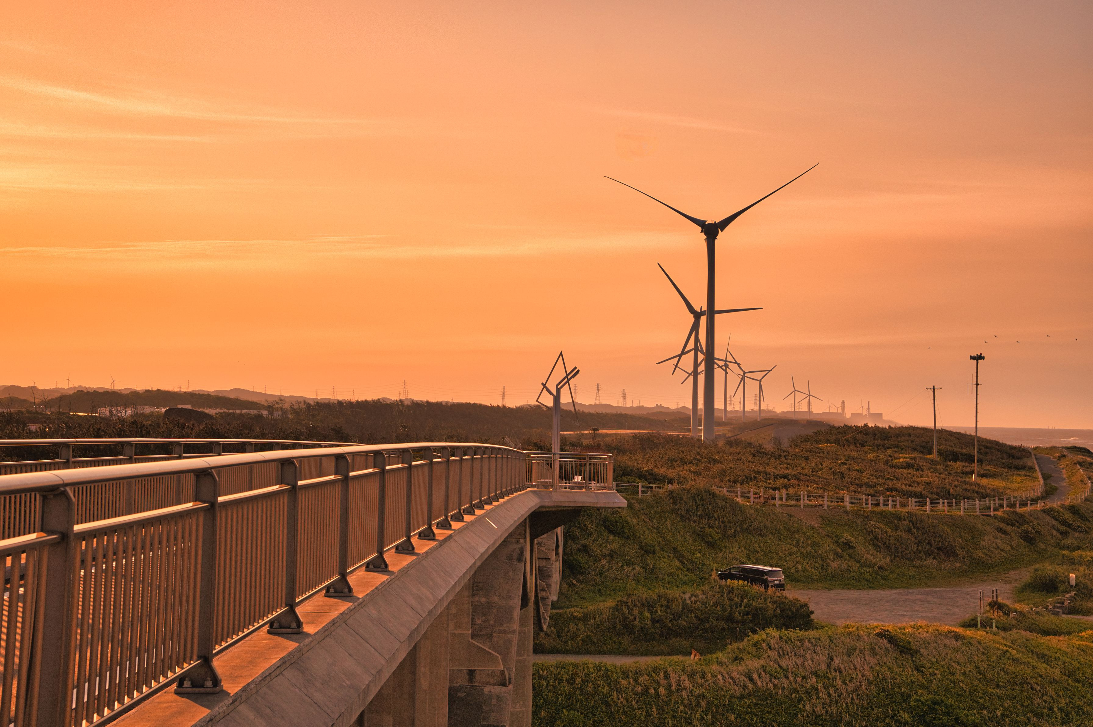 橋の上から 朝日が当たる風車を撮りました。 自転車と人だけ通ることができる橋。 右の自転車道に続いていきますが、最近は砂で埋もれて通行禁止です(^^;
