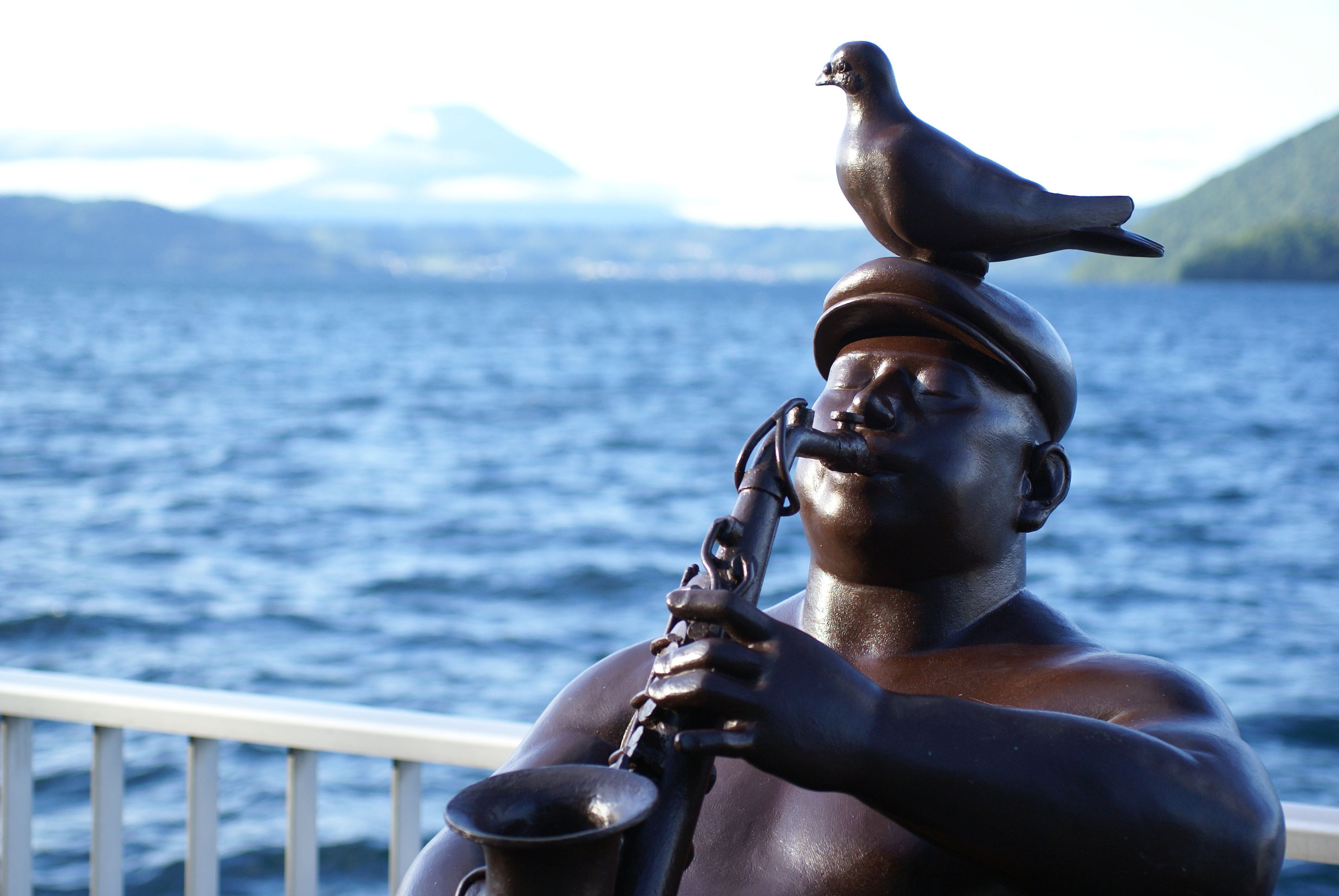 洞爺湖畔にはたくさんの美術彫刻があります。その中の一つ。 遠くに羊蹄山がうっすら。