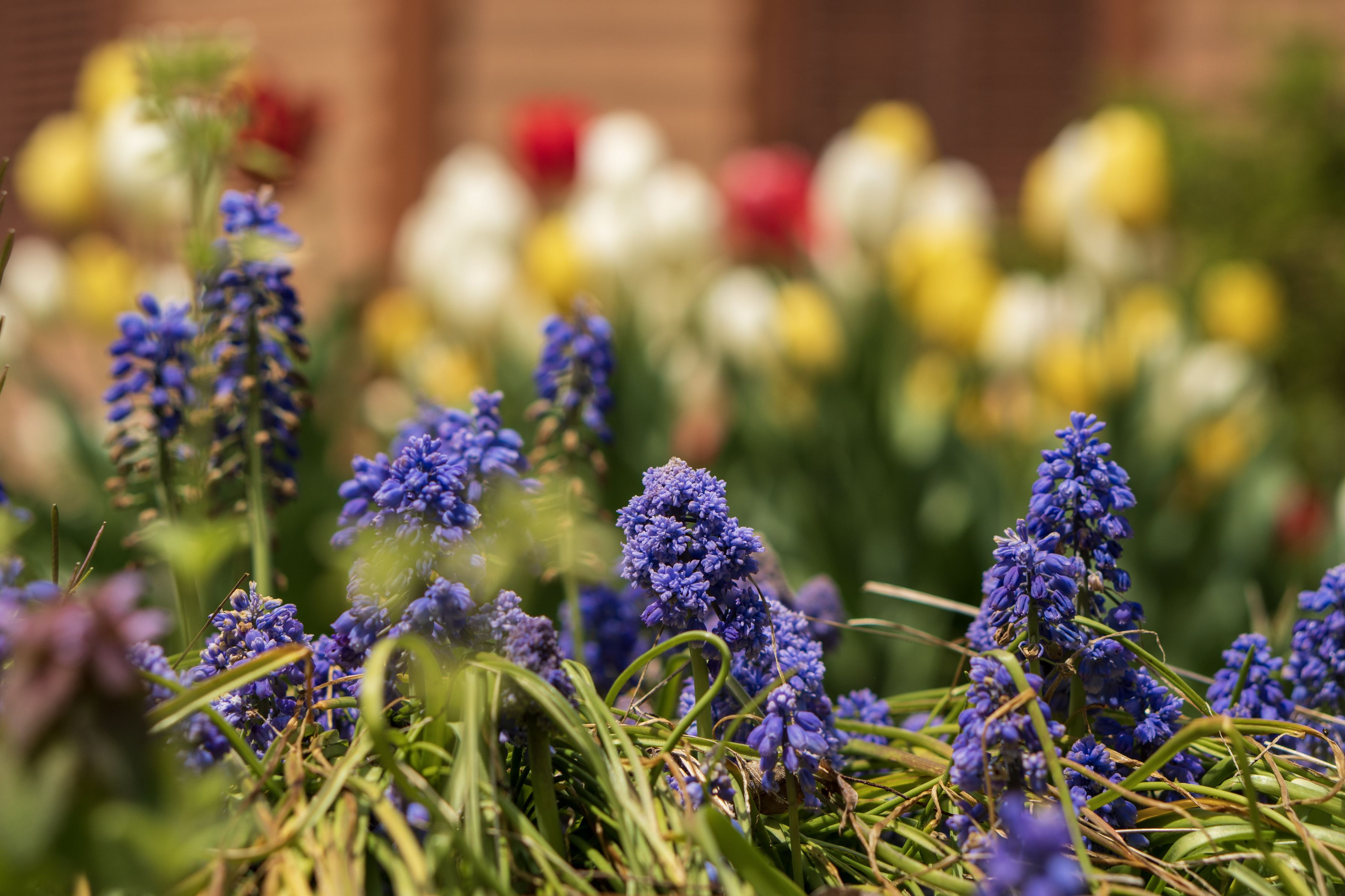 旅行先で花壇に咲くラベンダーとチューリップ