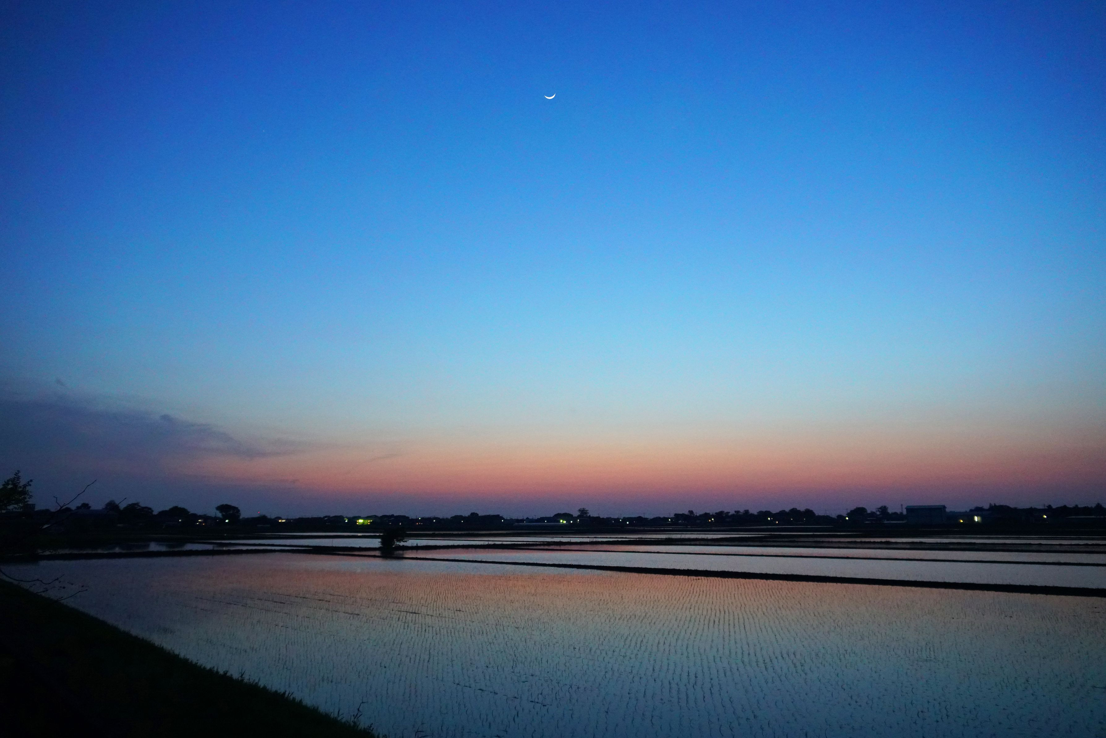 日没直後の薄明と田植え完了直後の水田です♪ 肉眼では“釣り針”のように鋭いお月様が、もっとx2大きく見ていたんですけど(笑) 改めて人間の目の補正能力は凄いと実感♪