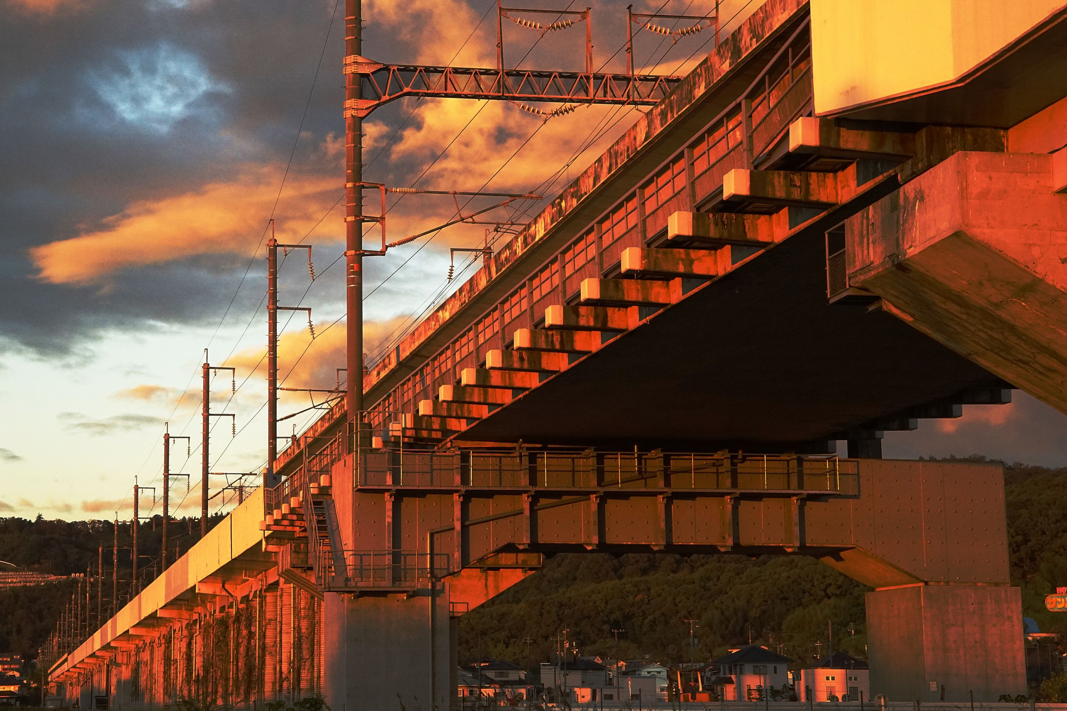 早朝散歩で撮った1枚です。日の出過ぎの、赤く染まる新幹線高架橋です。すごい色でした。自然は芸術家です。