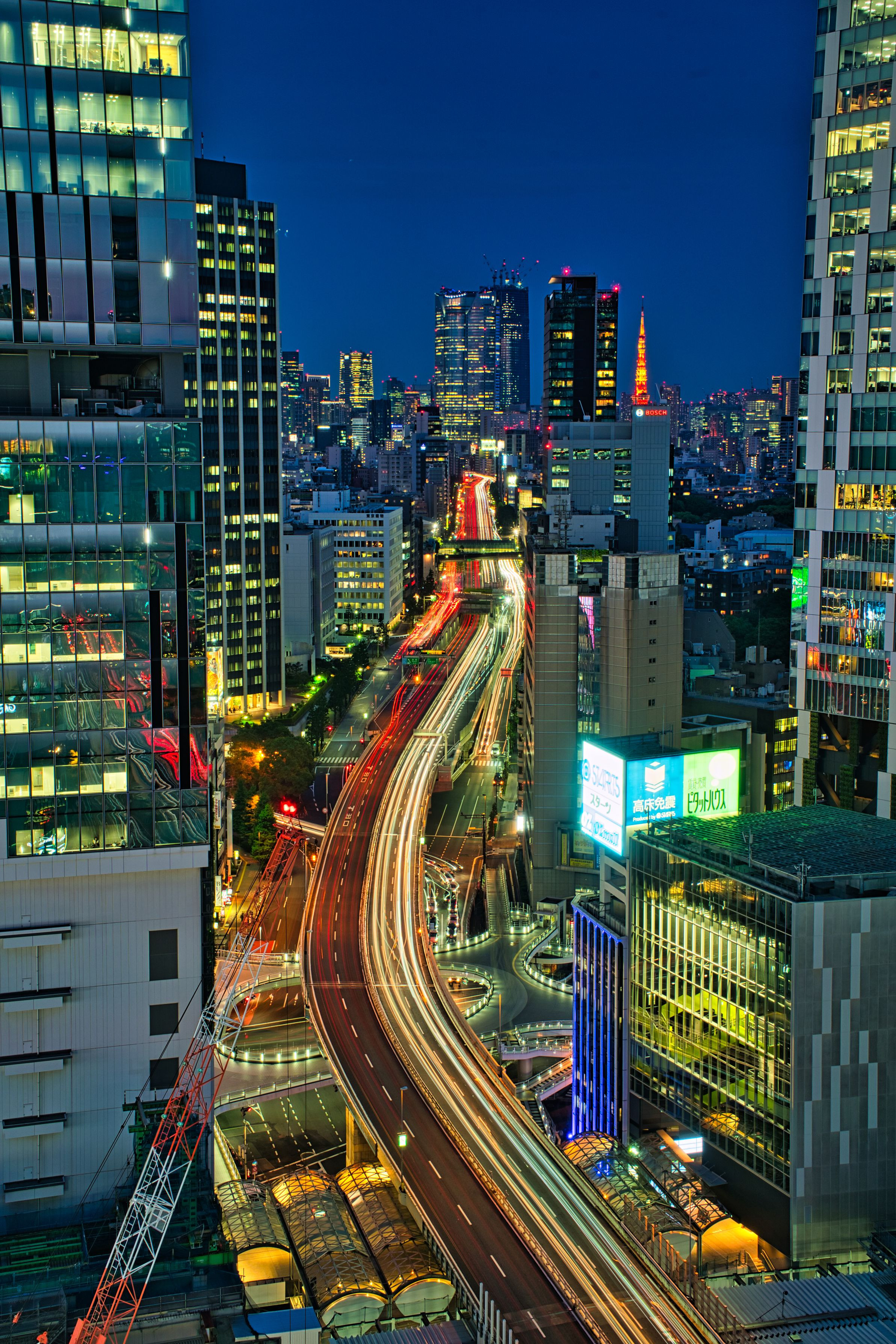 渋谷フクラス17F:屋上テラス SHIBU NIWAからの渋谷夜景 手前はかまぼこ型の旧東急渋谷駅・渋谷ヒカリエ・渋谷ストリームを望む その先は六本木ヒルズ・東京タワーへと続く首都高渋谷線・光の川 三脚禁止なのでカメラを置いて長秒30秒で撮りました。