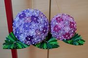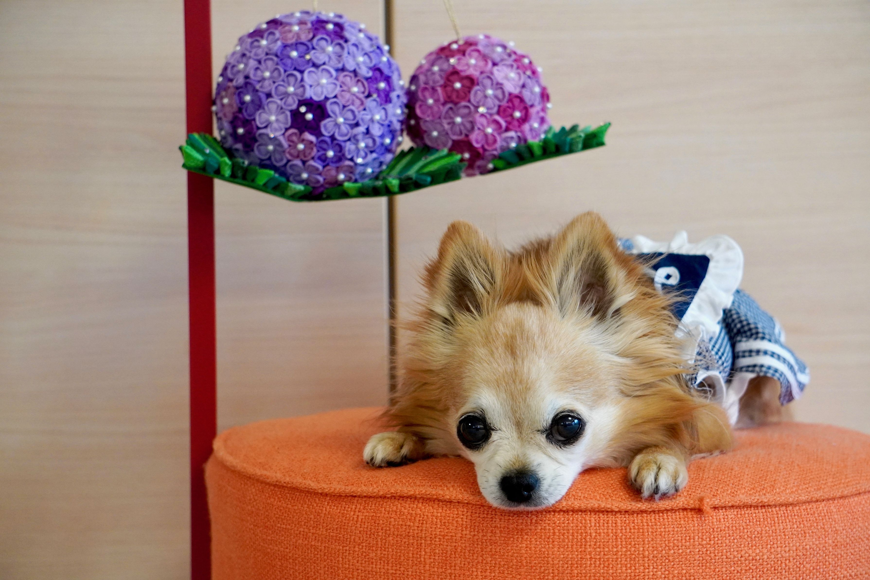 やっと製作中の紫陽花が完成しました。 紫陽花を吊って、オレンジ色の台を置いたら ちょこが走って飛び乗ってくれました。 ここは自分のお立ち台と思っているようです(笑)