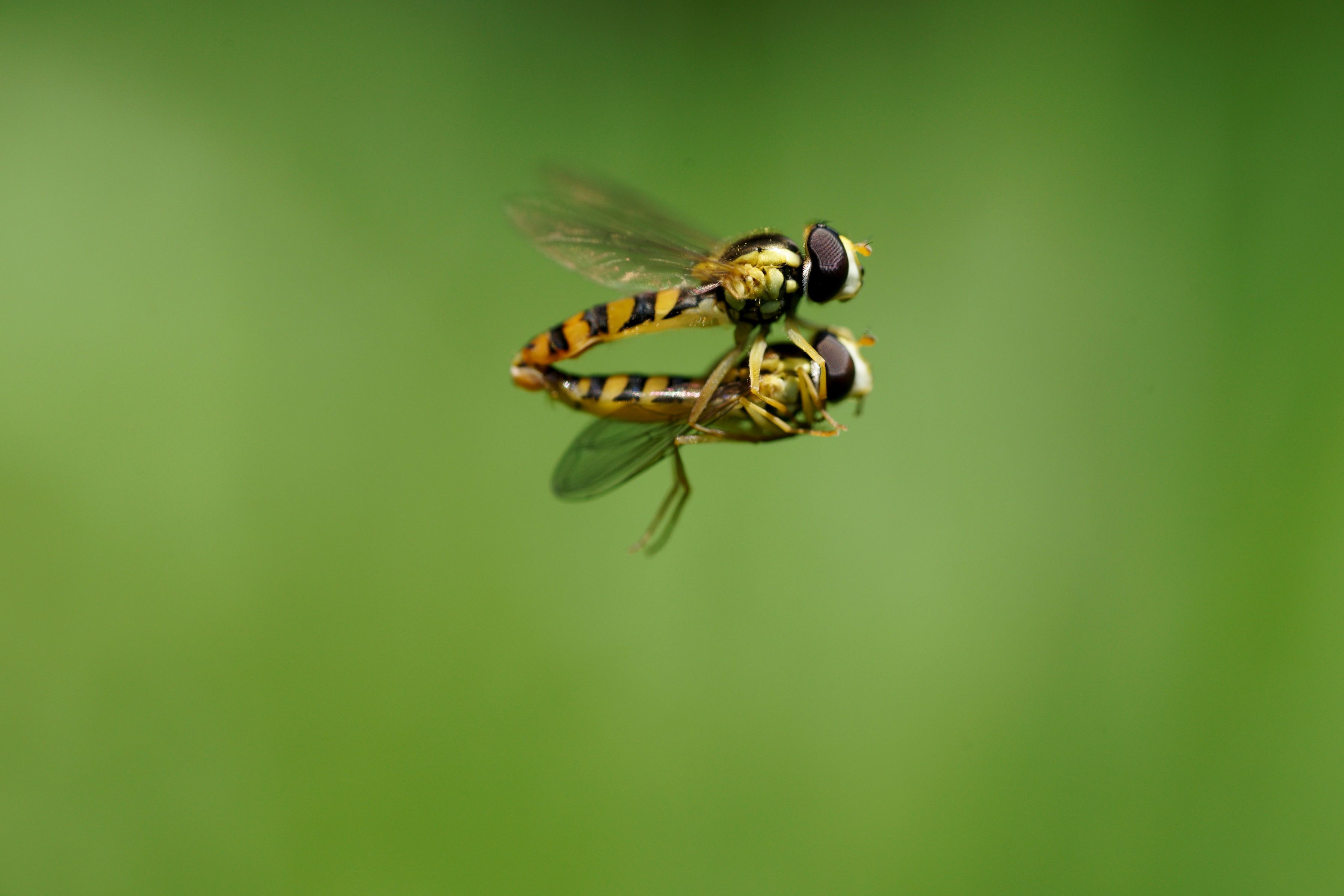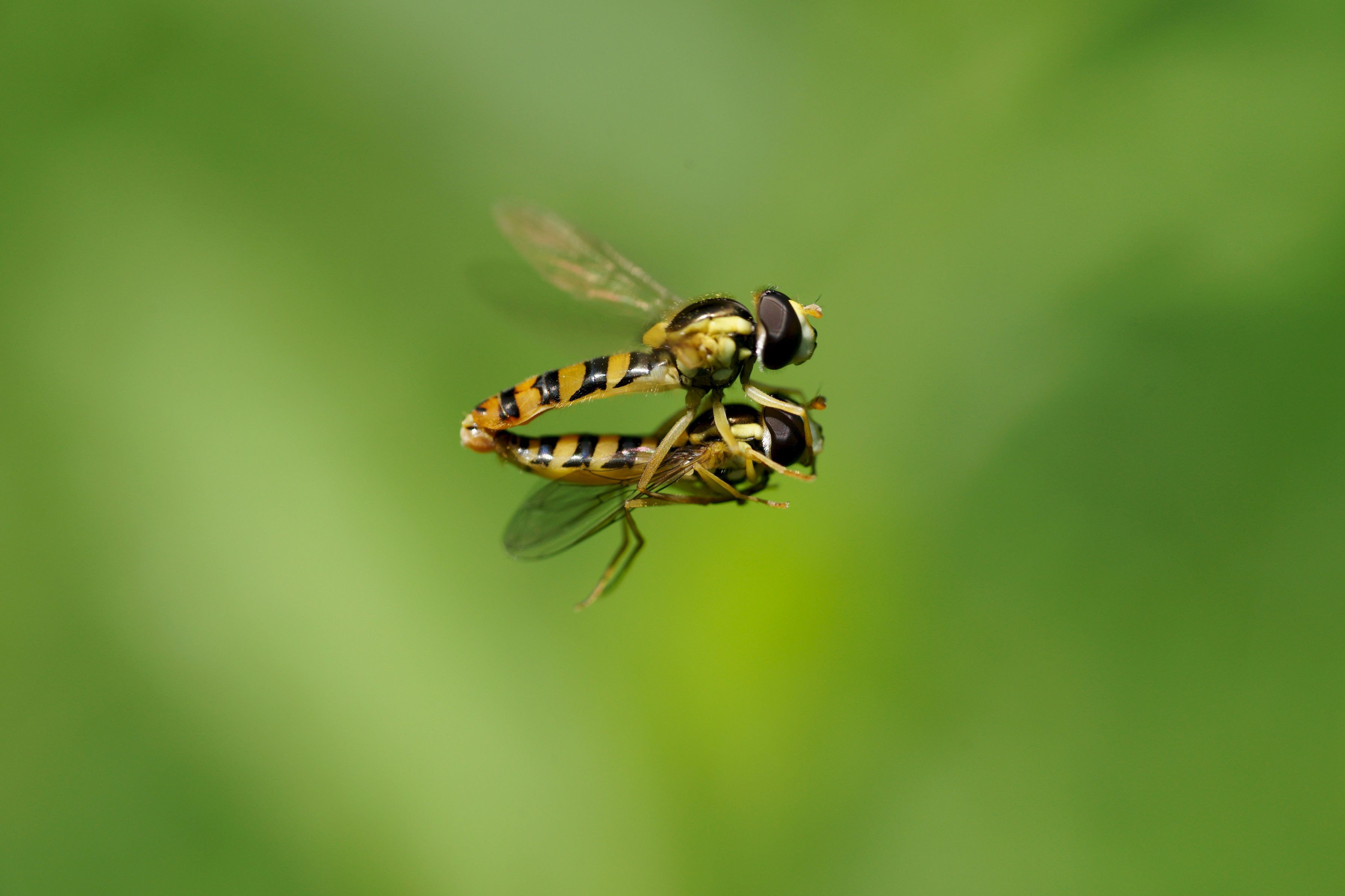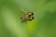 ヒメヒラタアブが草むらでランデブー飛行中です。オスメス両方に合わせられなかったのが残念です。 SIGMA 70mm EX DG MACRO使用。等倍撮影です。