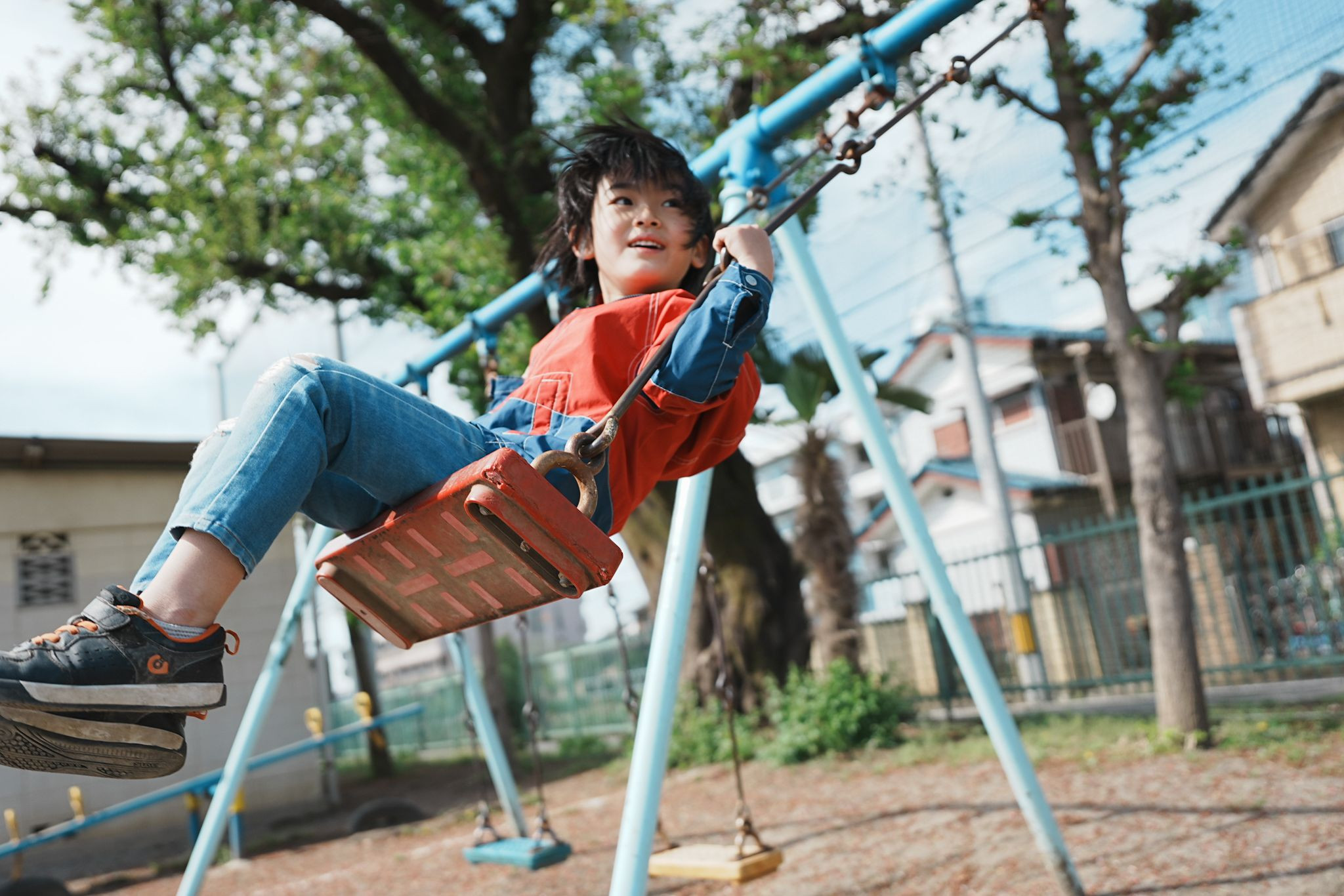 ブランコに乗る長男。 立ちこぎは禁止だそうです。時代ですね、、、。 ピントは外してしまいましたが、お気に入りの1枚です。