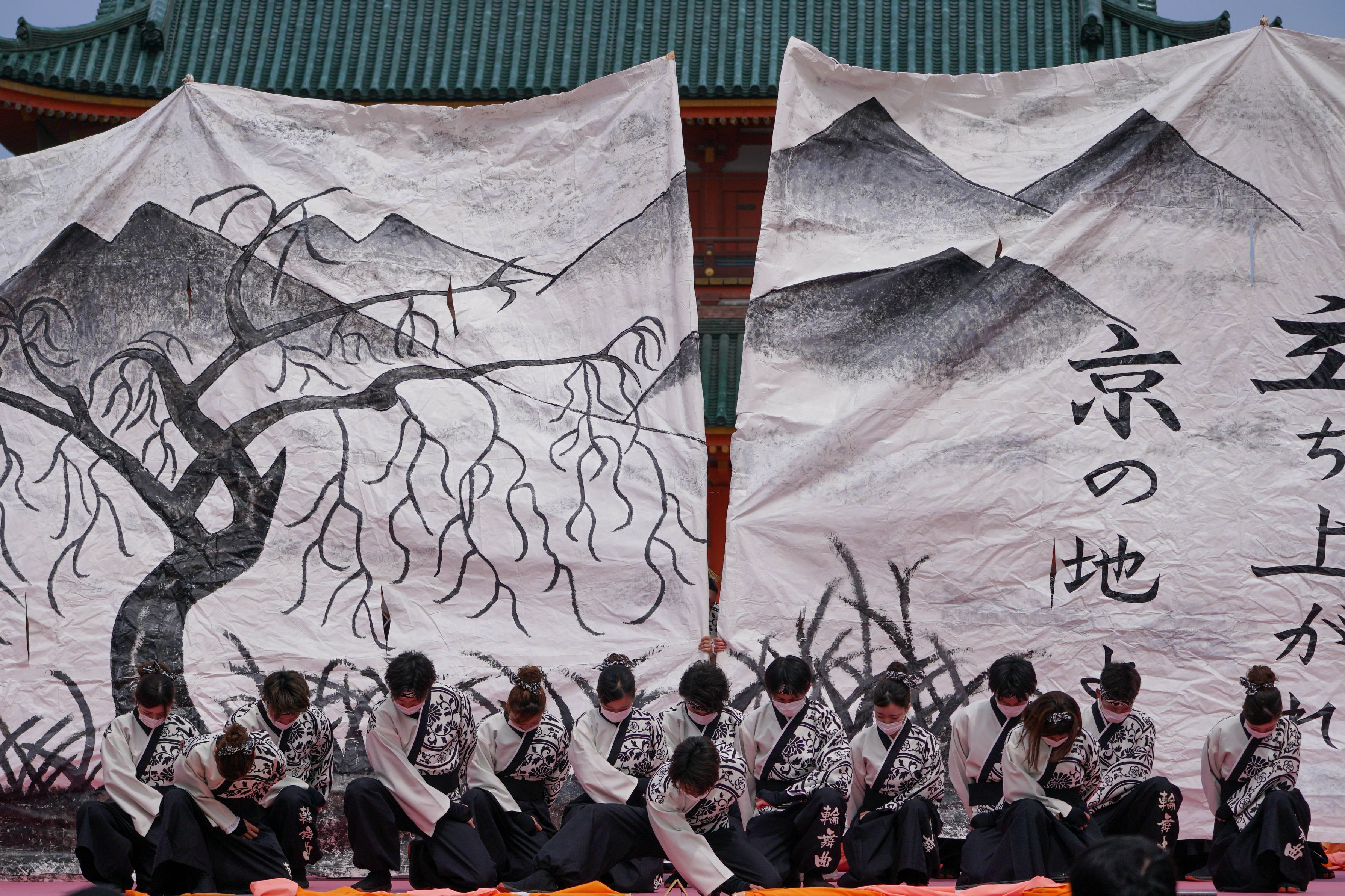 平安神宮の楼門の前での演技です。