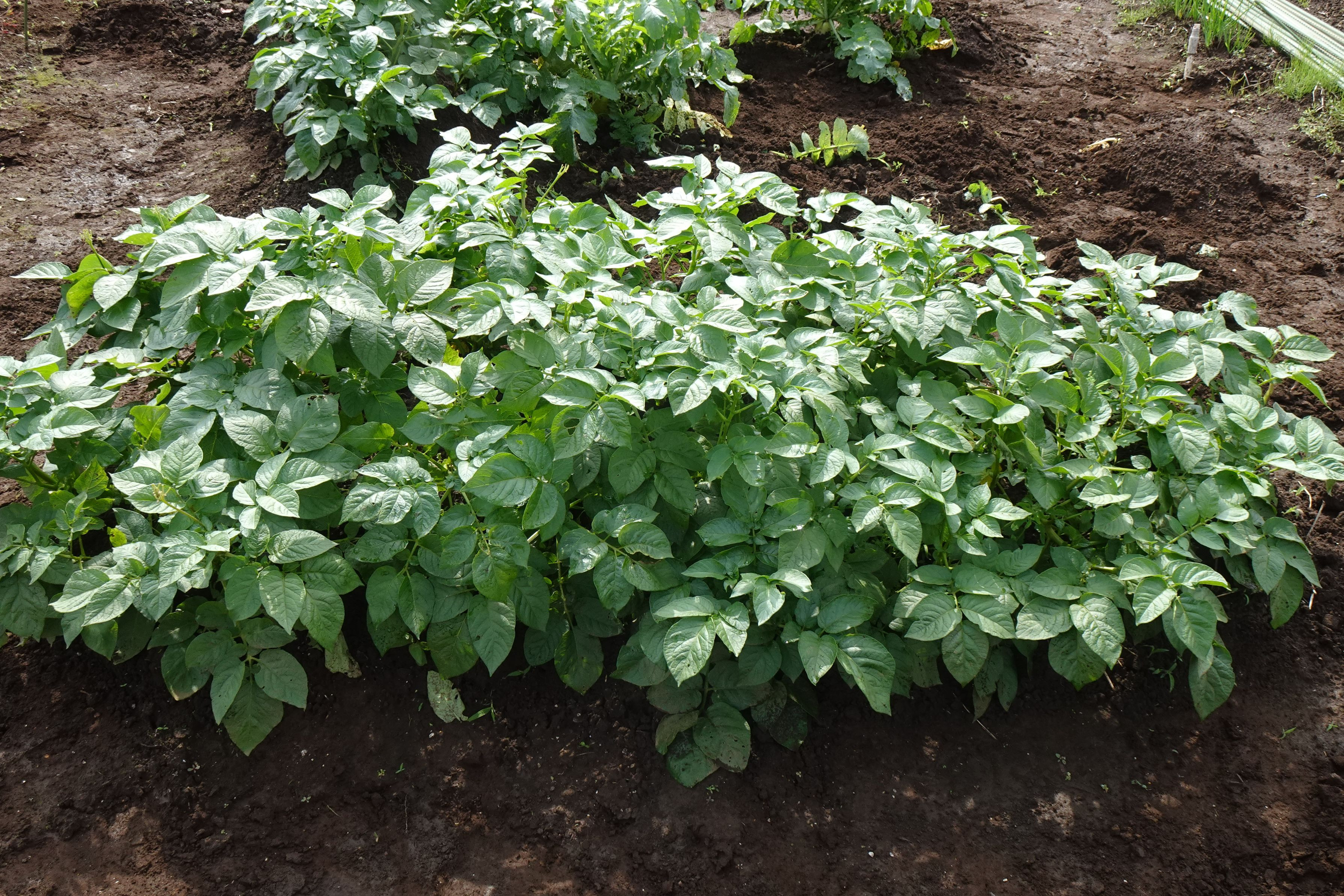 「玉ねぎ」と、育ち盛りの「ジャガイモ」をカシャッです。 玉ねぎは、毎回、食べる分だけ収穫。
