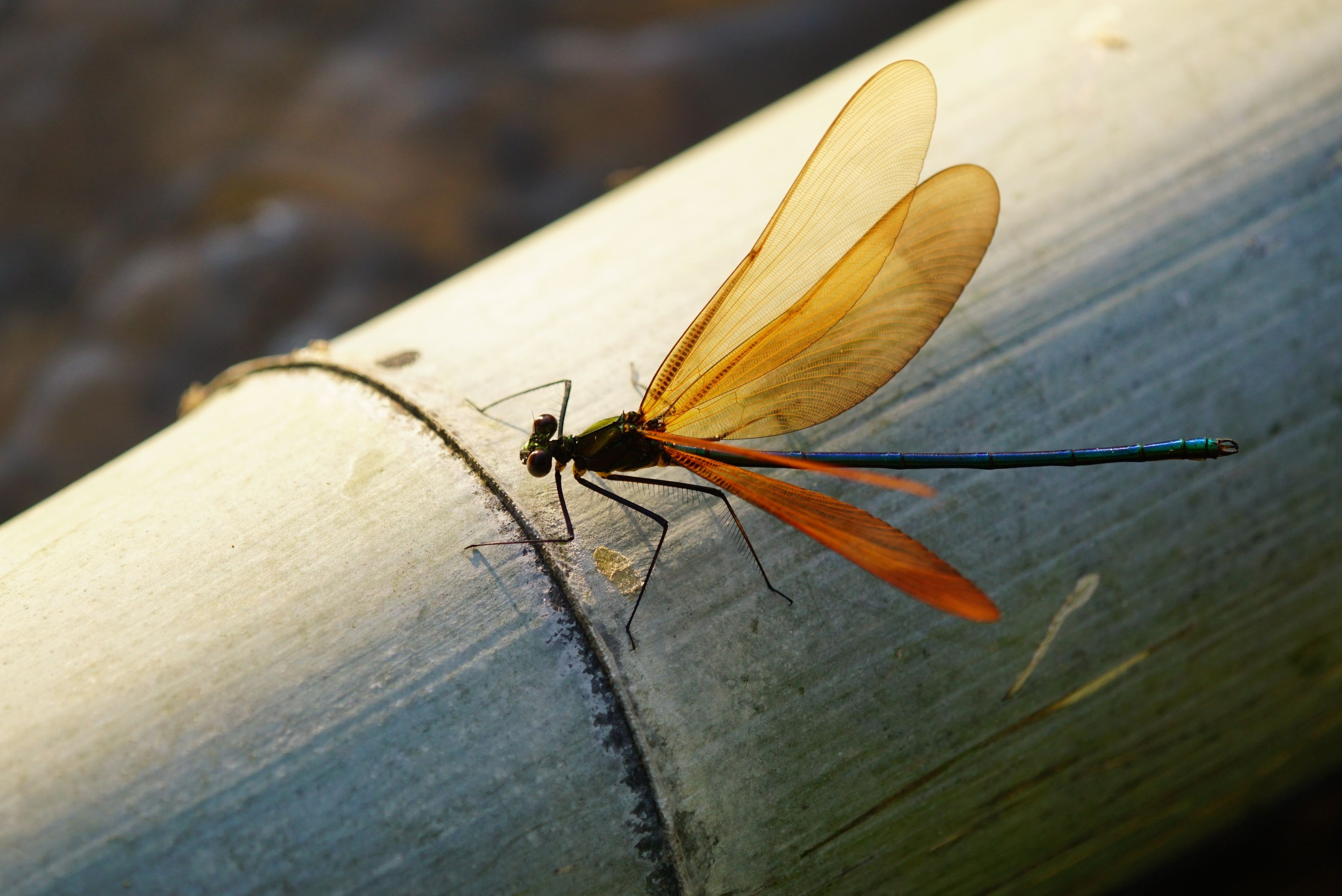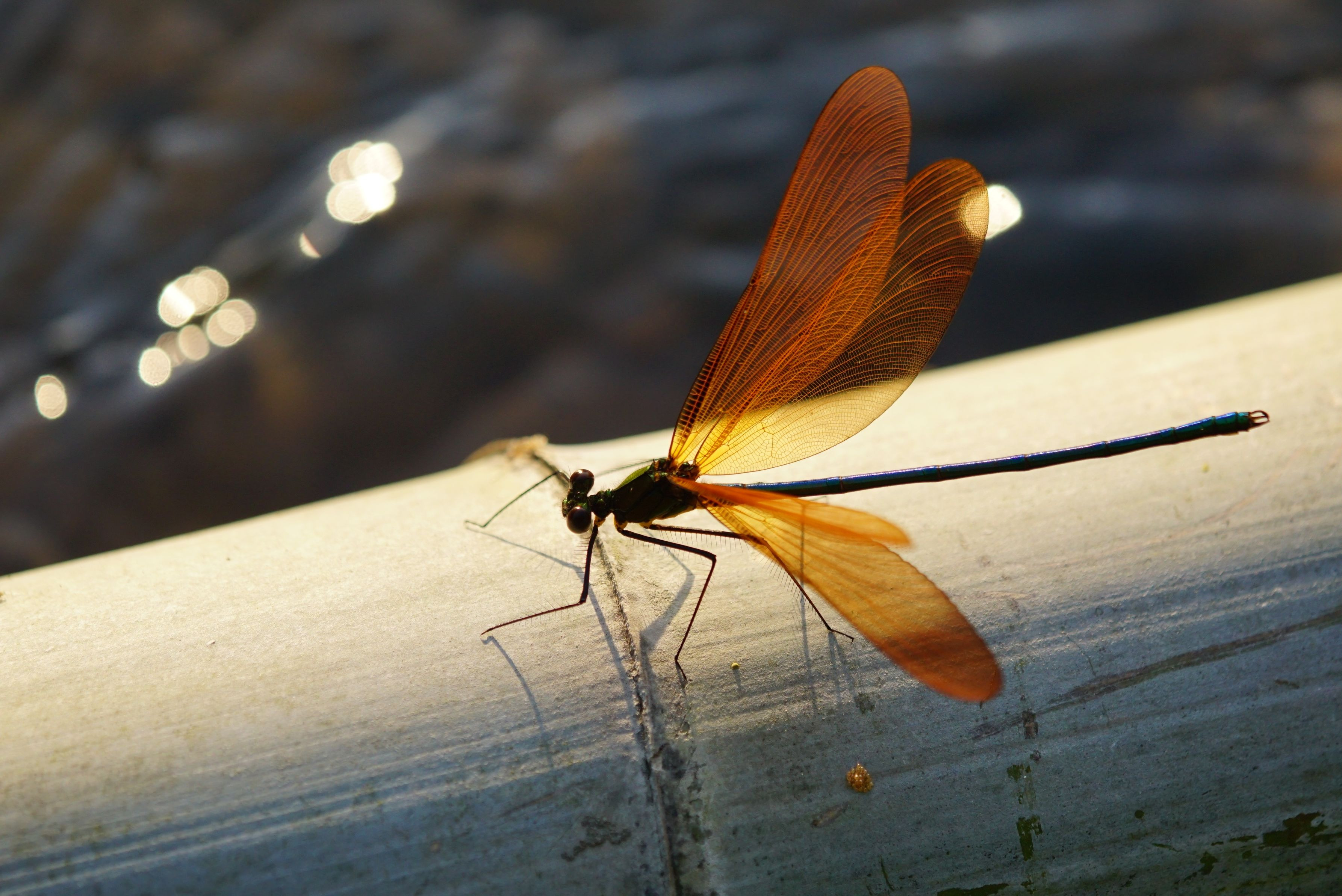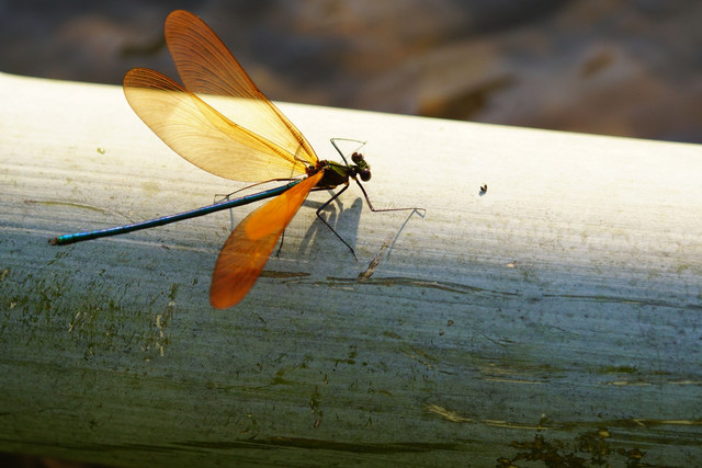 水辺の青竹に留まるミヤマカワトンボの♂。翅を開くと強い西日を浴びて、美しく煌めいていました。