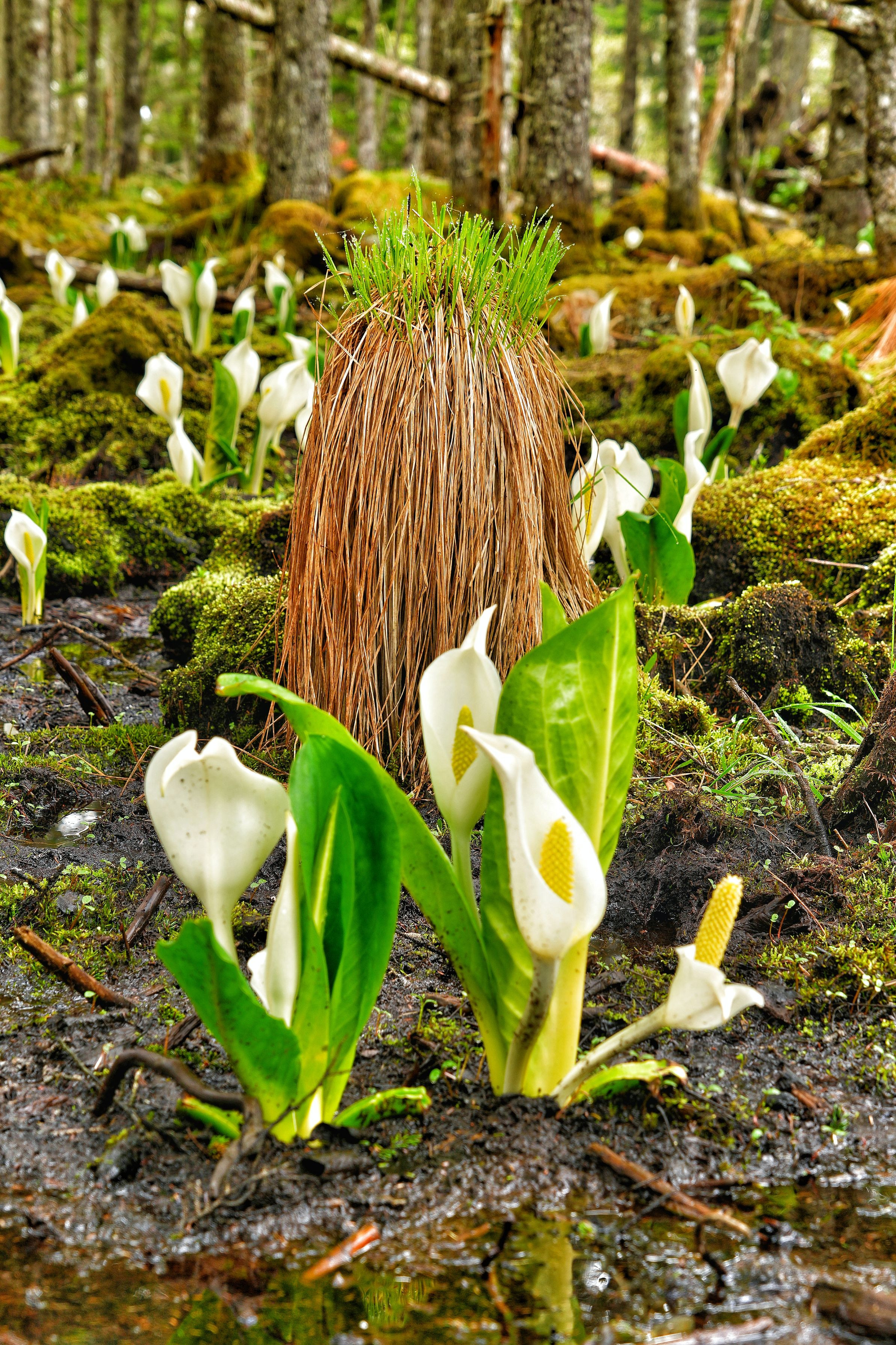 水芭蕉も見事なのはこの場所では当たり前だが、見事に育った谷地坊主を一緒に見れるのも此処ならでは しかも、頭のてっぺんにチョコっと水滴が見えるのは何とも愛らかったです!