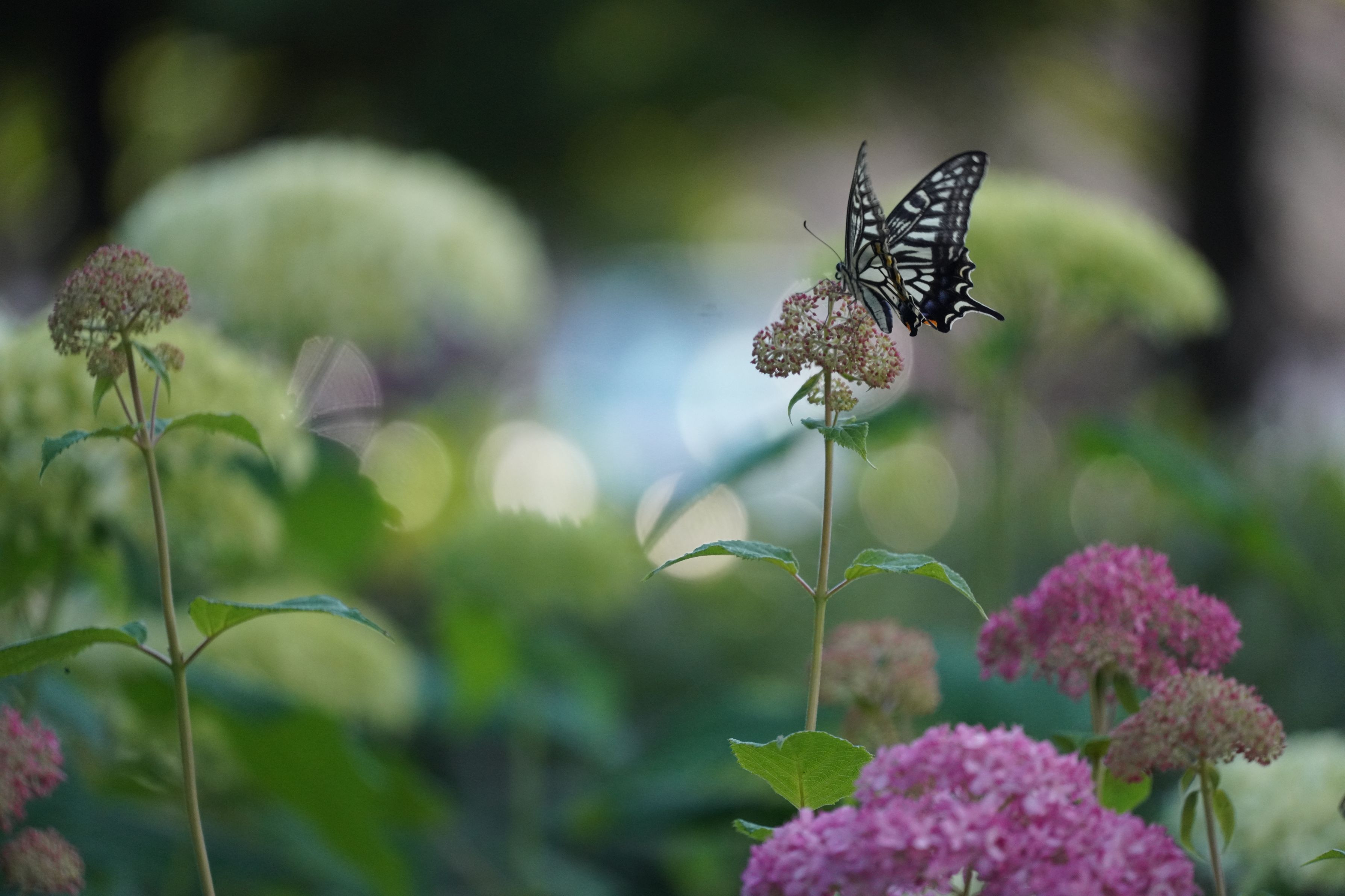 朝のアジサイに蝶が止まっていました。ずっと動かなかったのですが、どうやら温度が低く体が動かなかったようです。何度も羽ばたいた後どこかに飛んで行きました。