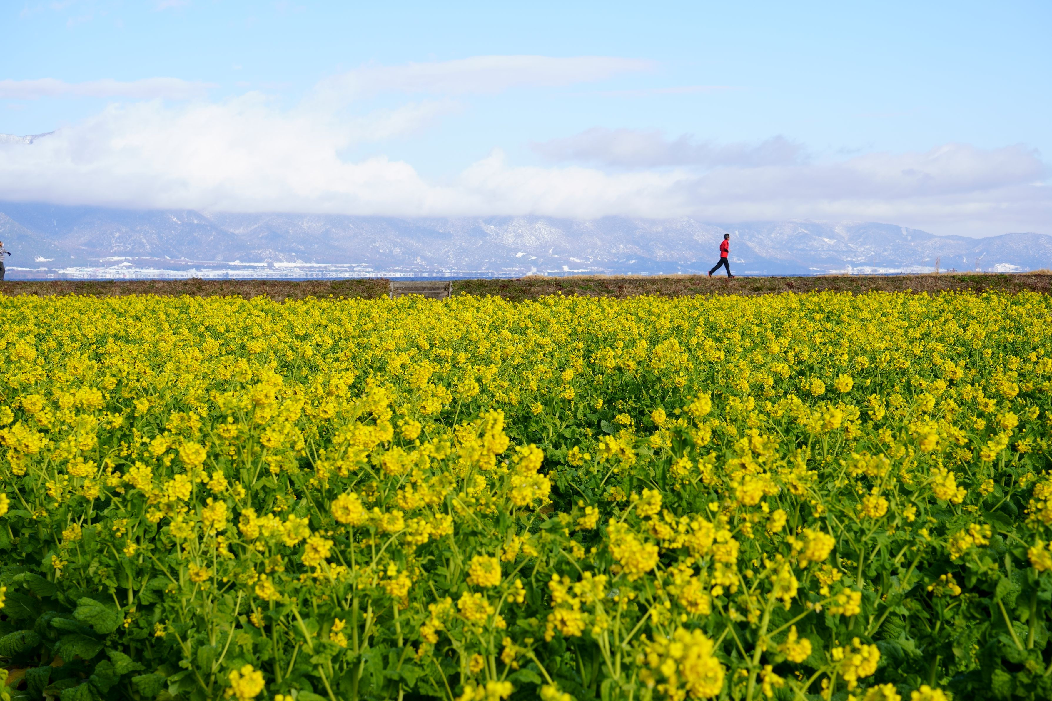 琵琶湖湖岸の菜の花畑を走り抜けるランナー、気持ちよさそうです。
