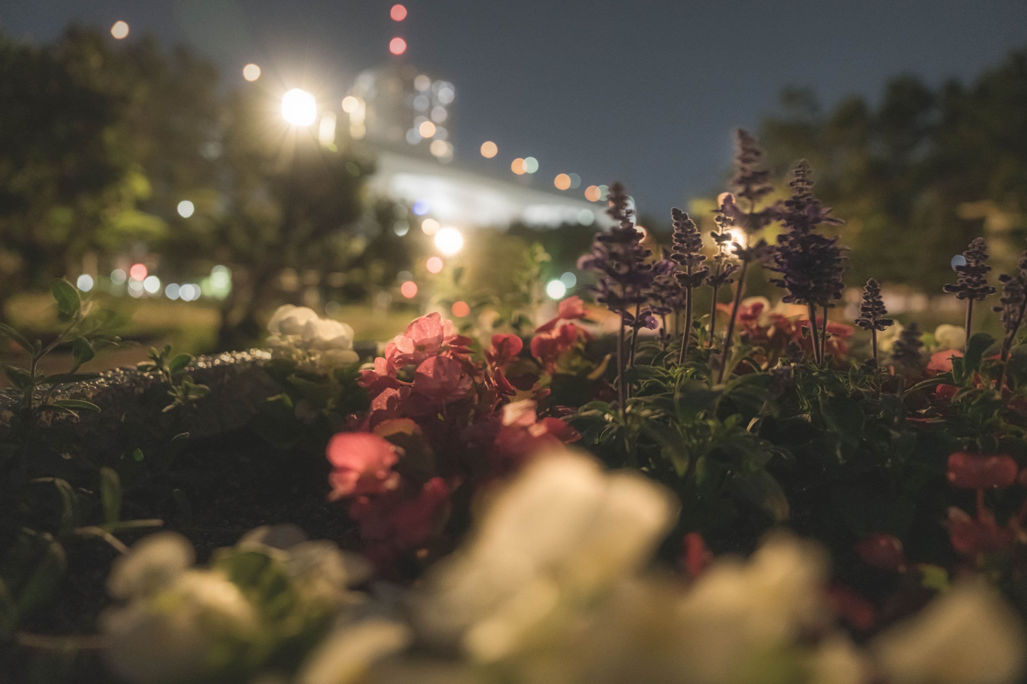 夜の公園にて 街灯やビルの灯りを受けて やんわりしたお花を撮ってみました。