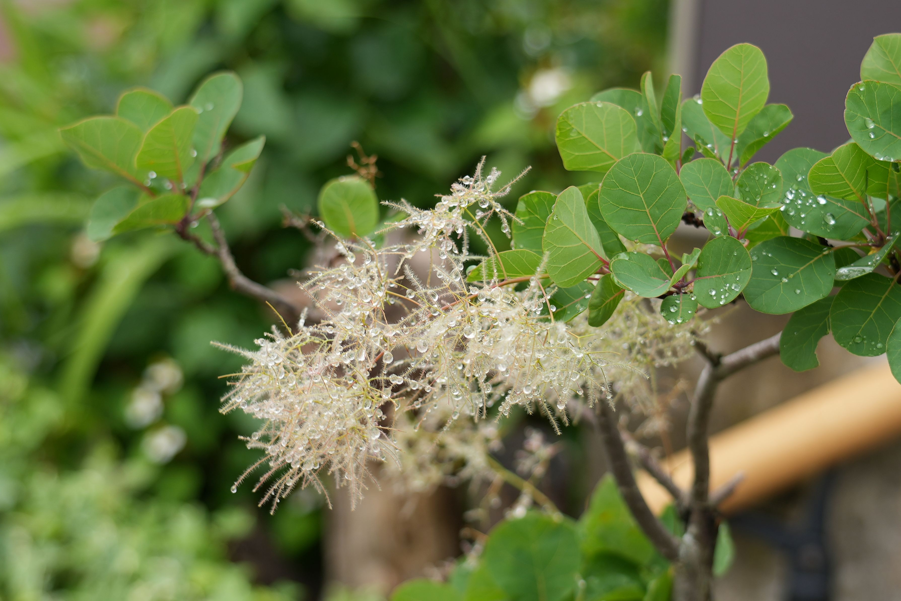 スモークツリーに細かな雨粒がびっしり、堕ちまいと必至に堪えています。