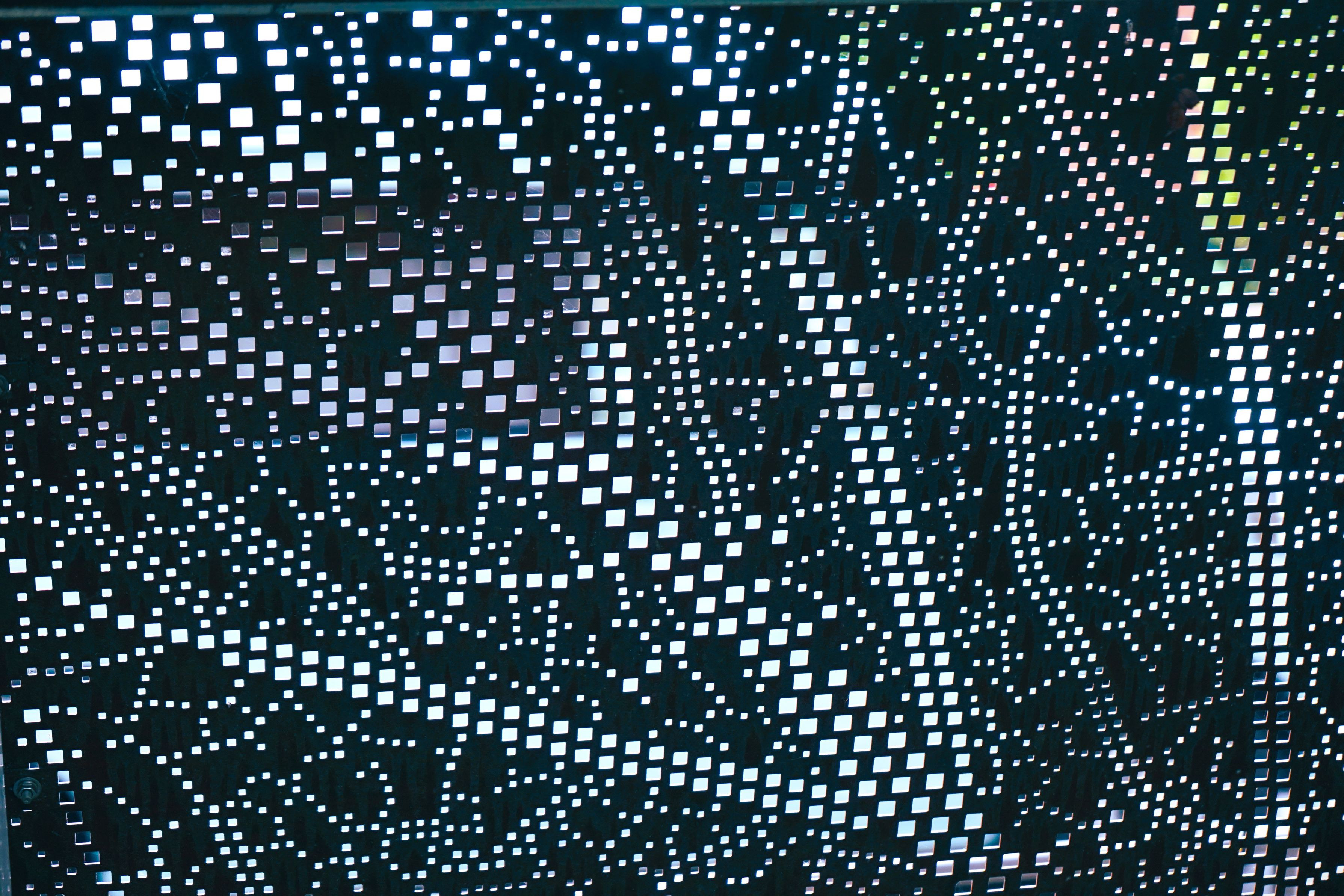 植物園の入口左側を囲むヘンスで金属製の板に穴で模様が描かれています。 園内から撮ると外の景色の色合いが出て、色々な色合いが探せます。