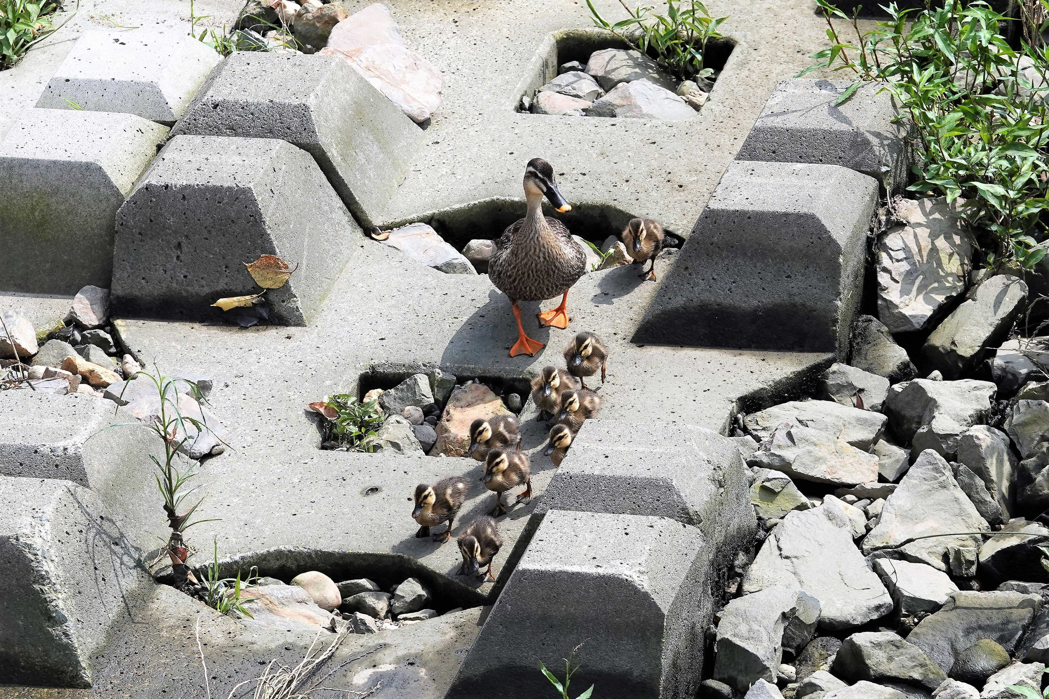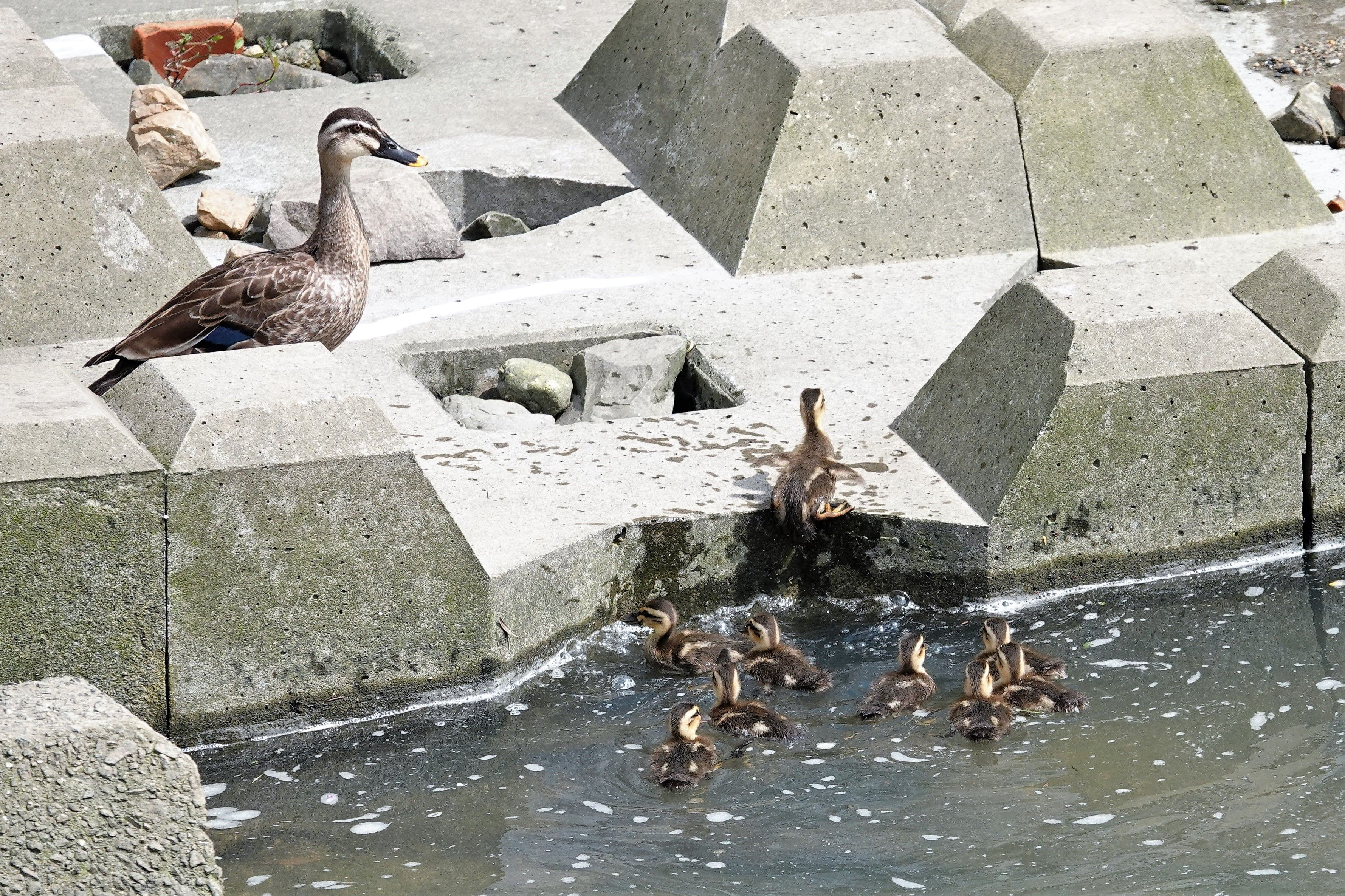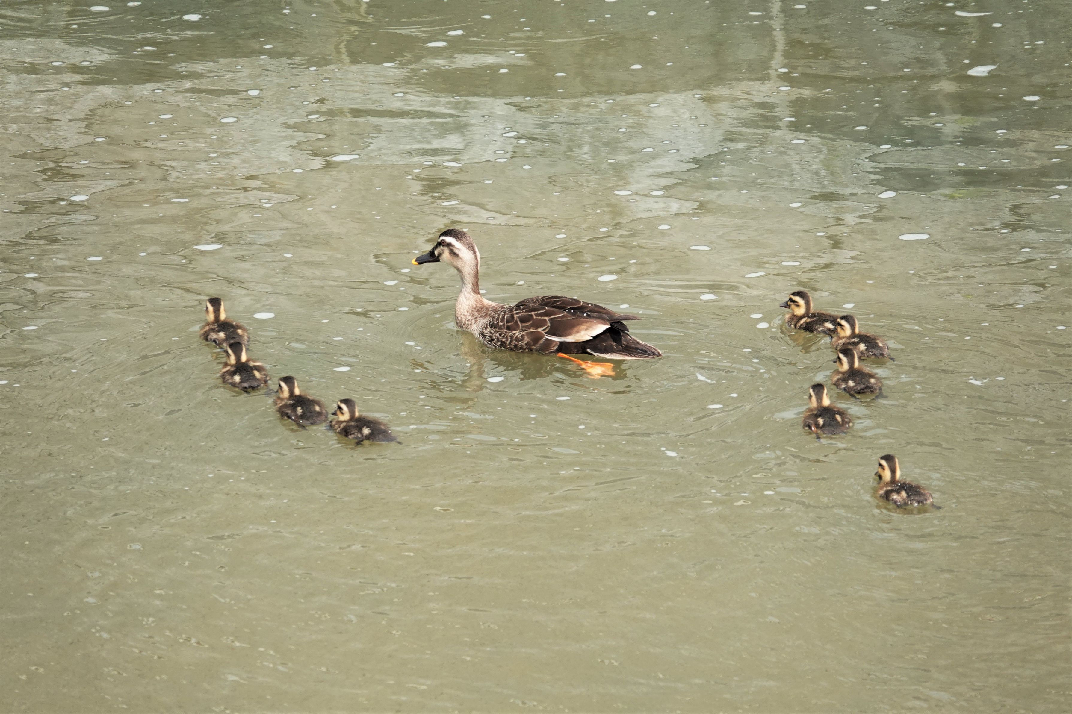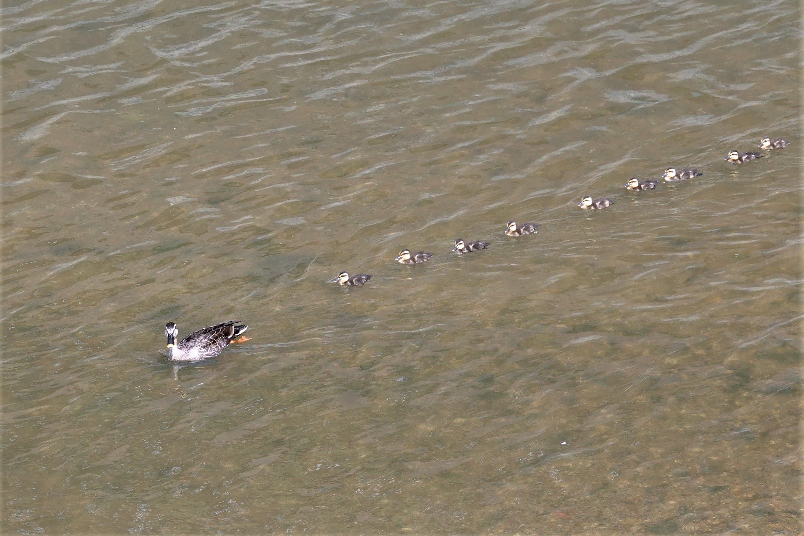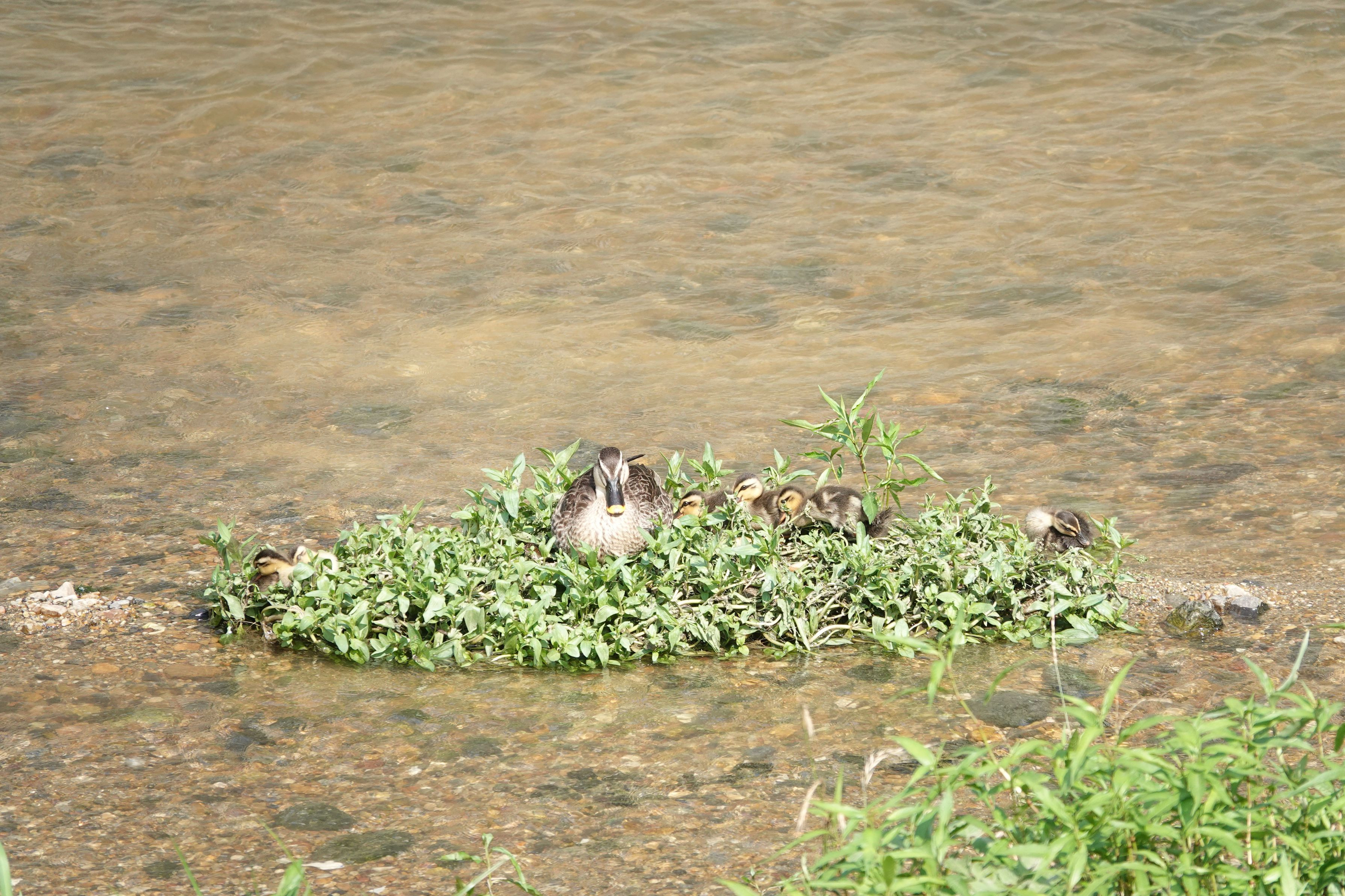山崎川に#カルガモ#親子が来ているとの情報を得て出掛けました。 昨日の朝刊で山崎川の上流で11羽の雛連れたカルガモの記事が出ていましたが、昨日の大雨で6KMほど流されたのではとのこと。ただ2羽減って9羽になっていました。