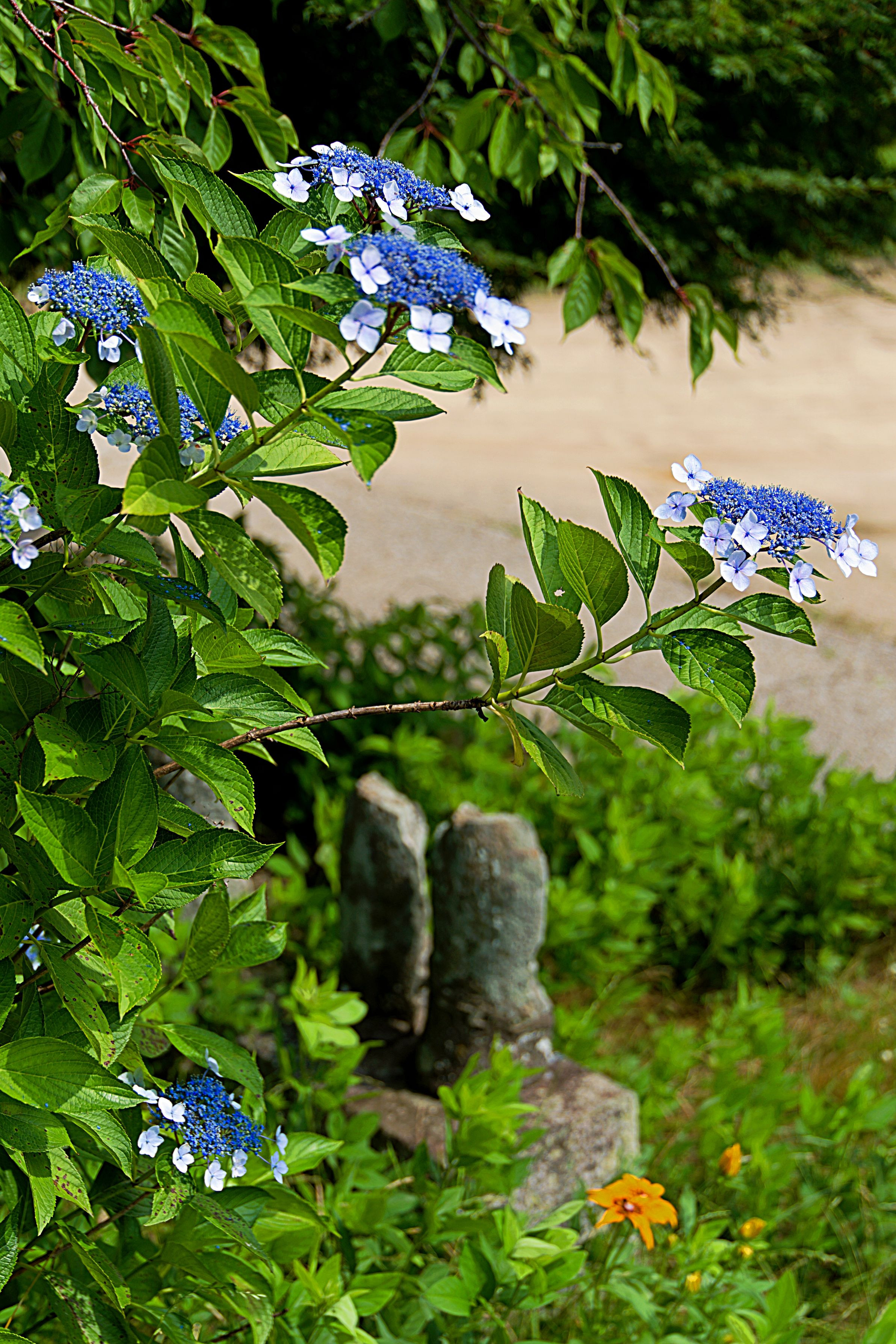 備中国分寺の五重塔近くで撮った1枚です。日本アジサイです。質素に石仏の裏で飾るように咲いていました。