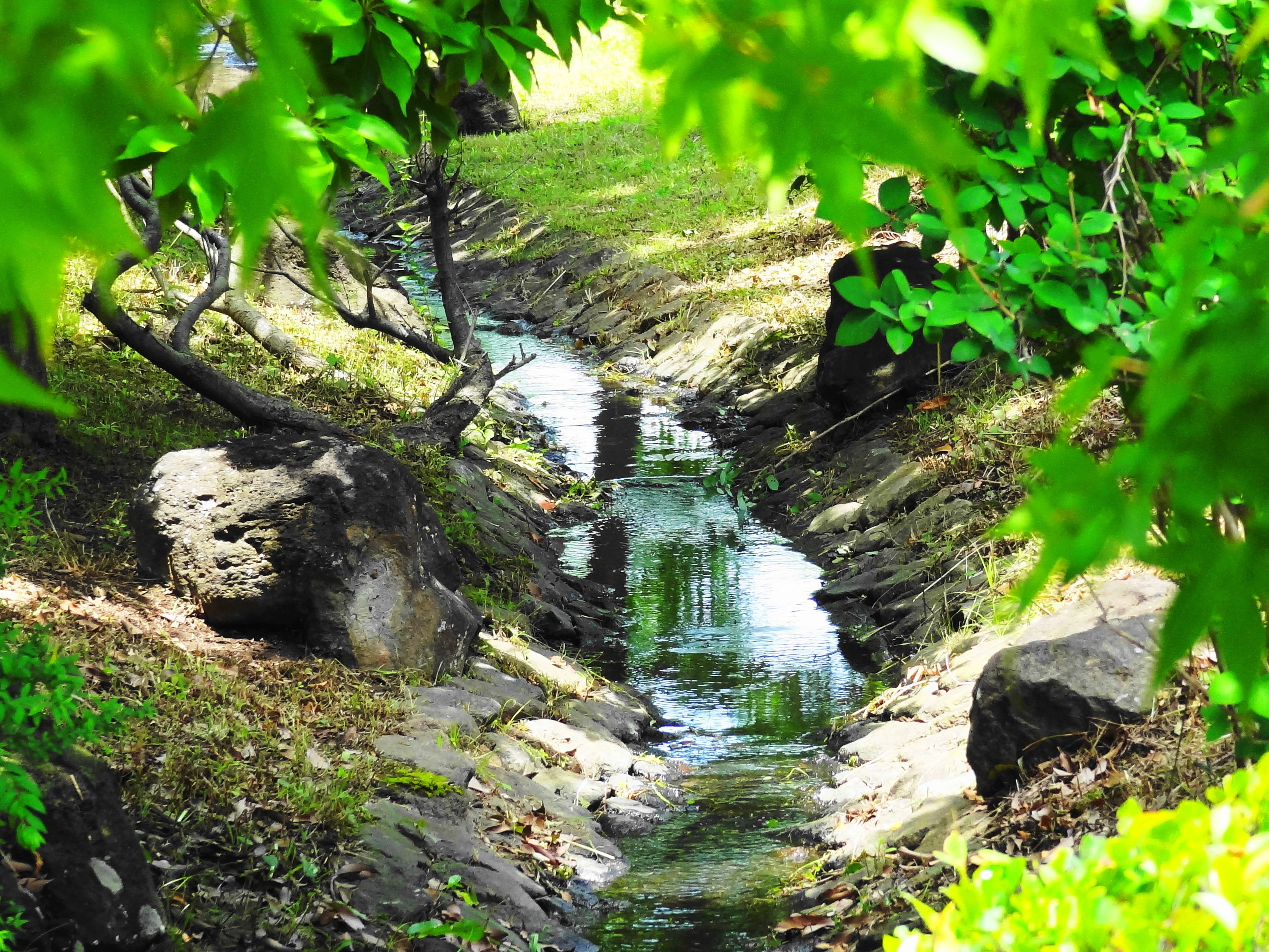 入梅前の快晴の日、散歩道(クリニック受診後の帰路)にて。1枚目は見上げた青空に不死鳥が大空へ羽ばたいているように見えたのでより奥行きがあるよう直線道路をぎりぎり入れて撮り、2枚目は俯いて水路の橋を渡っていたら水路に映る新緑が目にとまり屈んで撮りました。