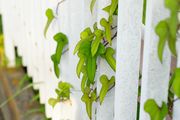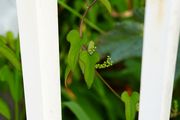 白い柵に新緑のツル、葉、鬱陶しいこの暑さに一時の清涼感を有り難う。