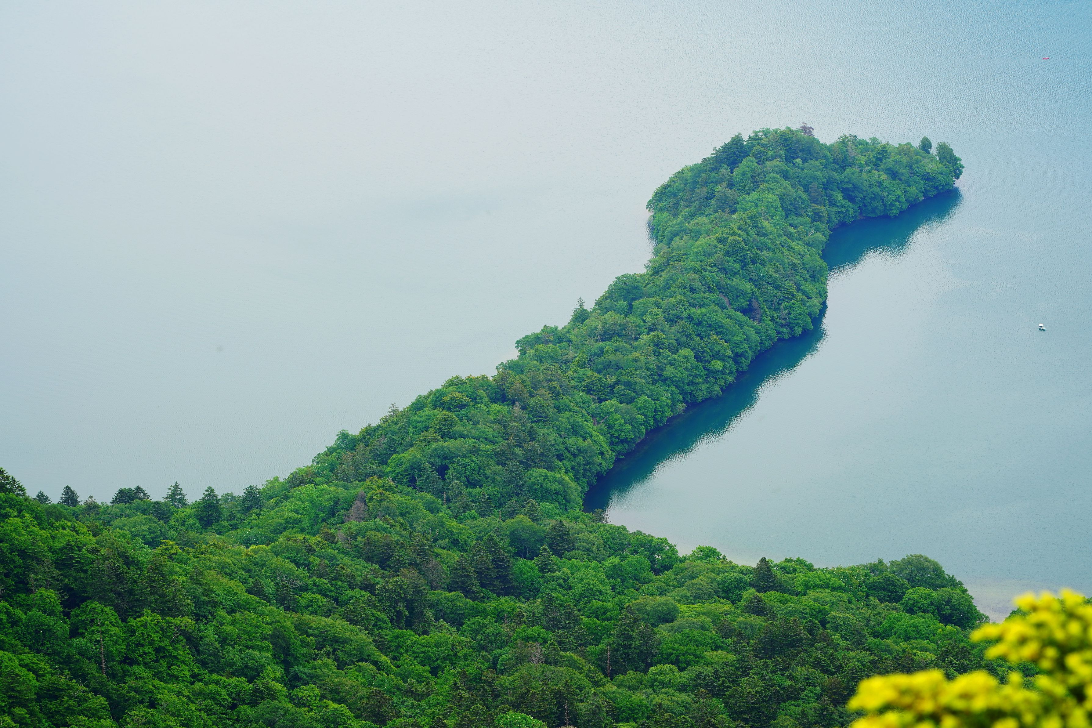 地球の営みが途方も無い時間を掛けて生み出した大自然の造形と、そこに鮮やかに色を添える新緑が織りなす初夏の大絶景を観た途端、山道を登って来た疲れが一気に吹き飛んだ。(半月山展望台より撮影)