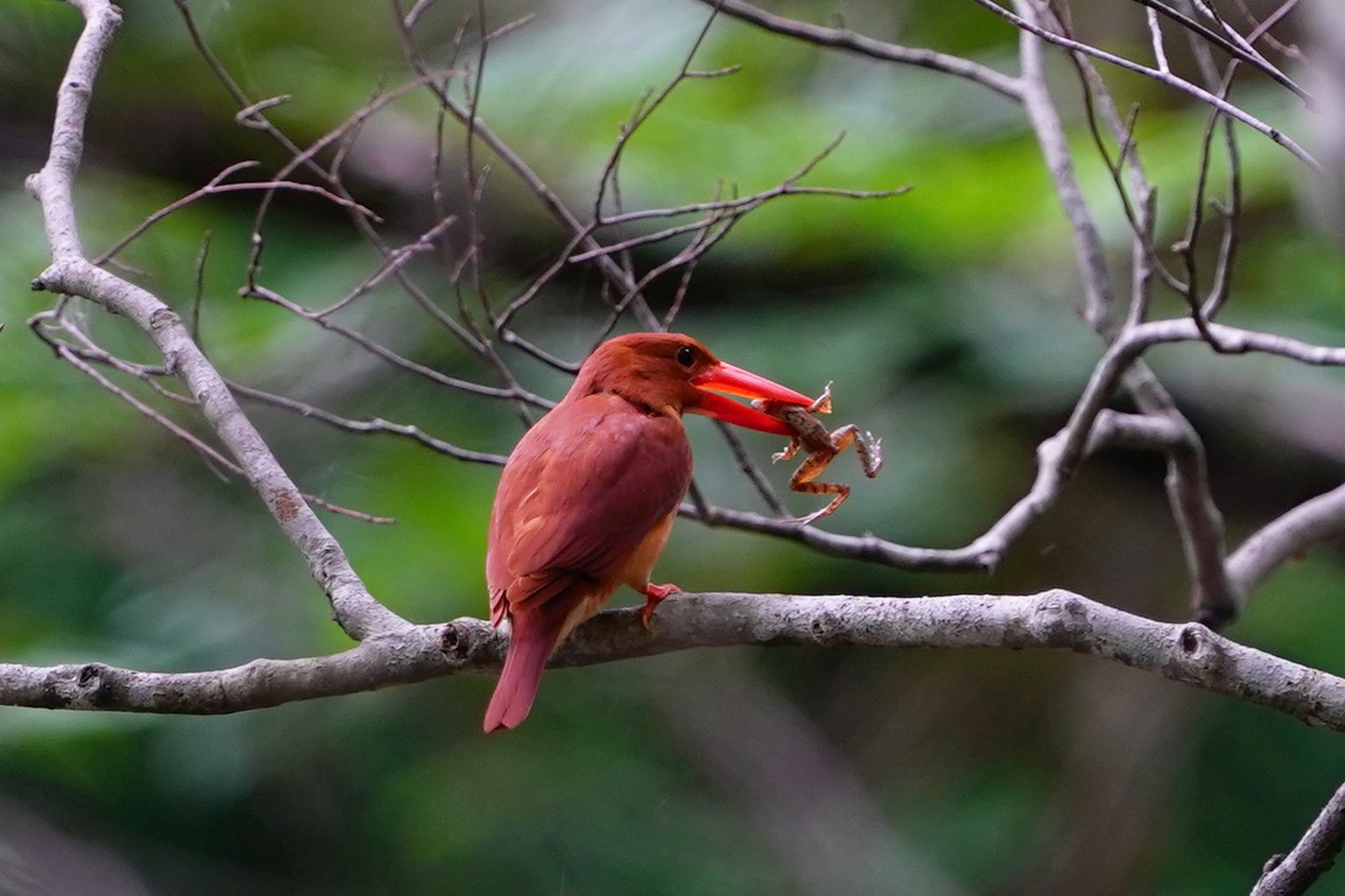 撮影条件はSS1/30。静止画像なら何とか頑張れると思った瞬間のエンゼルポーズ。ダメ元でシャッターを押したけれど期待は出来ない。しかし、1枚だけ何とか見られる写真になっていました!その後、突然、下降したと思ったら私の4mくらい先の法面でカエルを捕まえ40m先の枝に止まり叩きつけているではないですか!!設定を替える余裕もなく連写した結果・・・奇跡としか言いようがない(笑