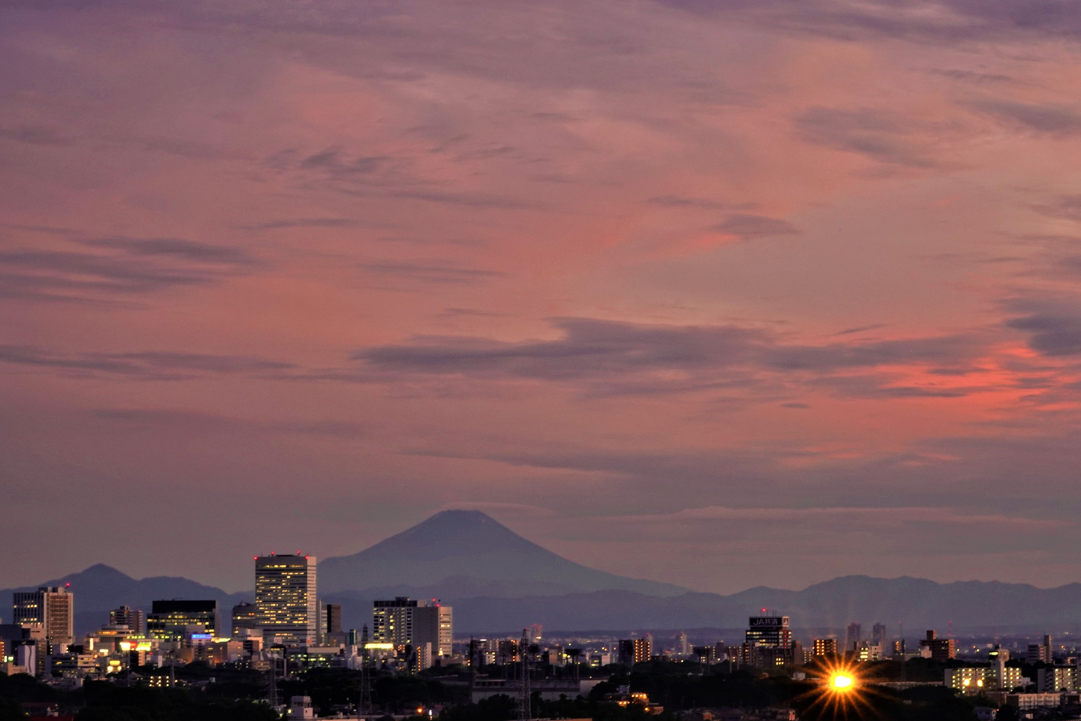 曇りの日が続く中で、この日久々に富士山が見えました 相変わらずゴチャゴチャした大宮の街並みとの組み合わせですが、 とても綺麗な夕映えの富士山でした。