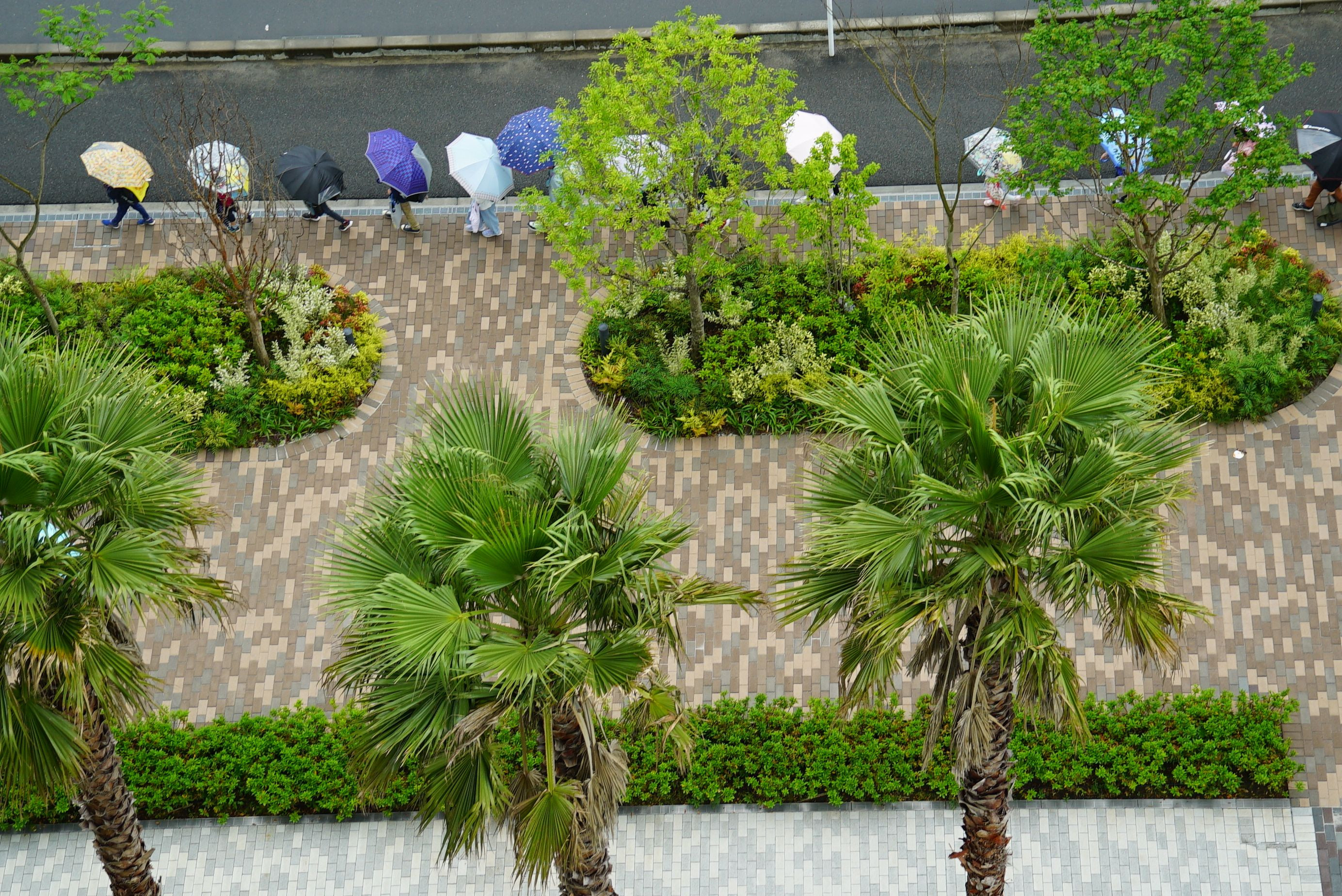 雨の朝、登校の列。