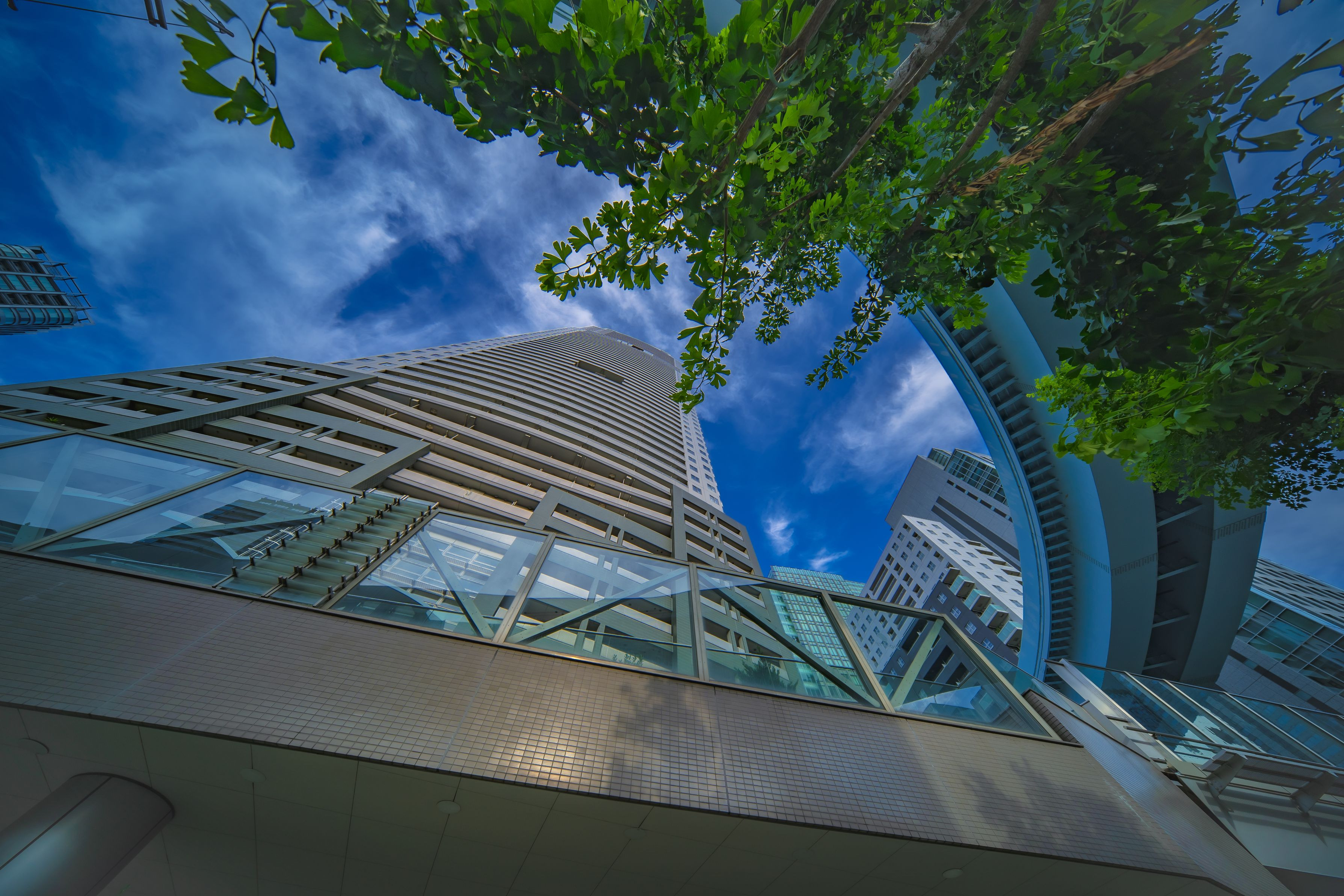 新都市交通がビルの合間を縫うように走っているところを超広角レンズLAOWA9mmで撮りました。