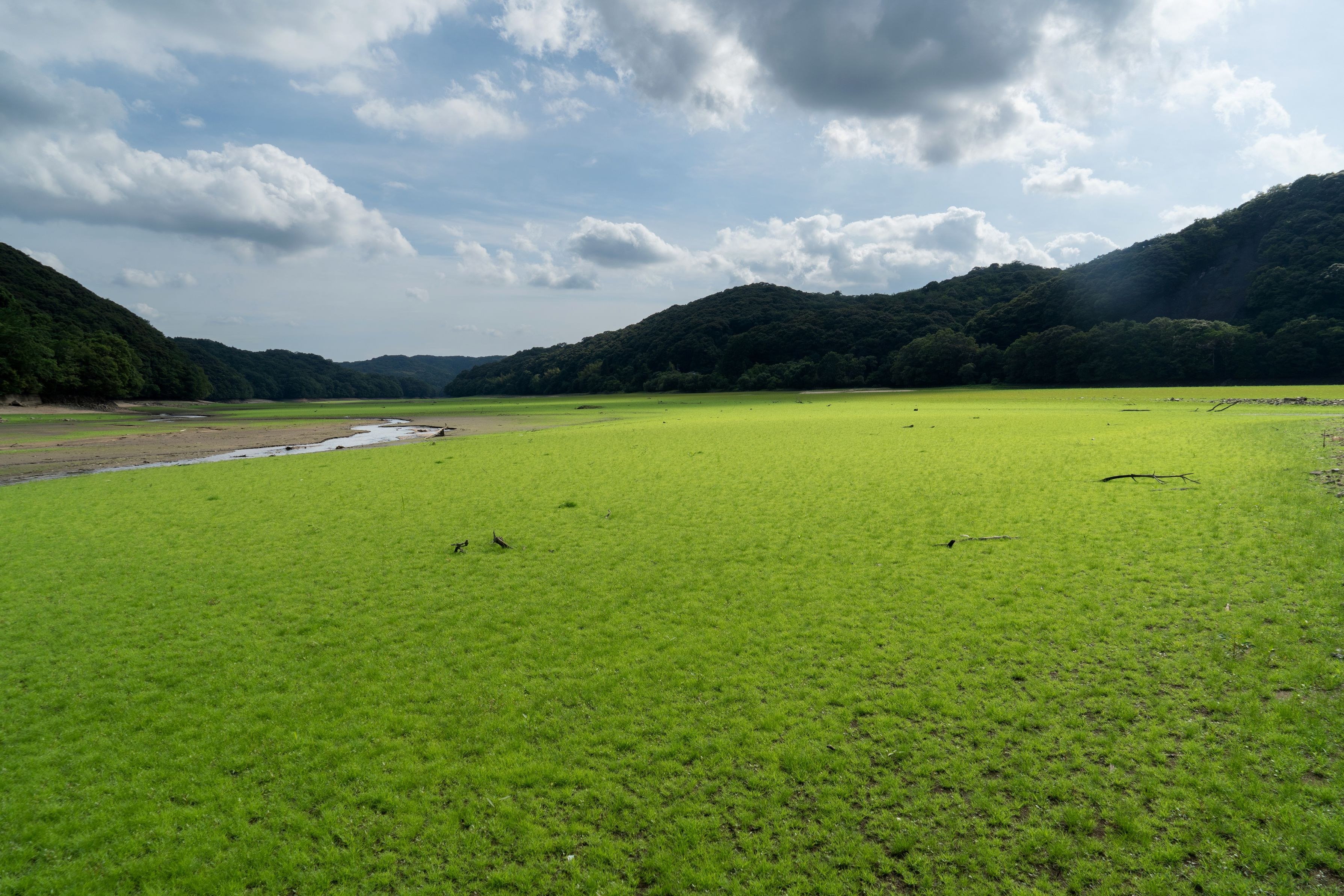 雨が全く降らない日が続き、近くのダム湖も水が無くなり草が生え・・・誰も見たことが無いような草原状態になりました その後、先日の大雨で一気に満水近くまで回復し、幻の光景となりました