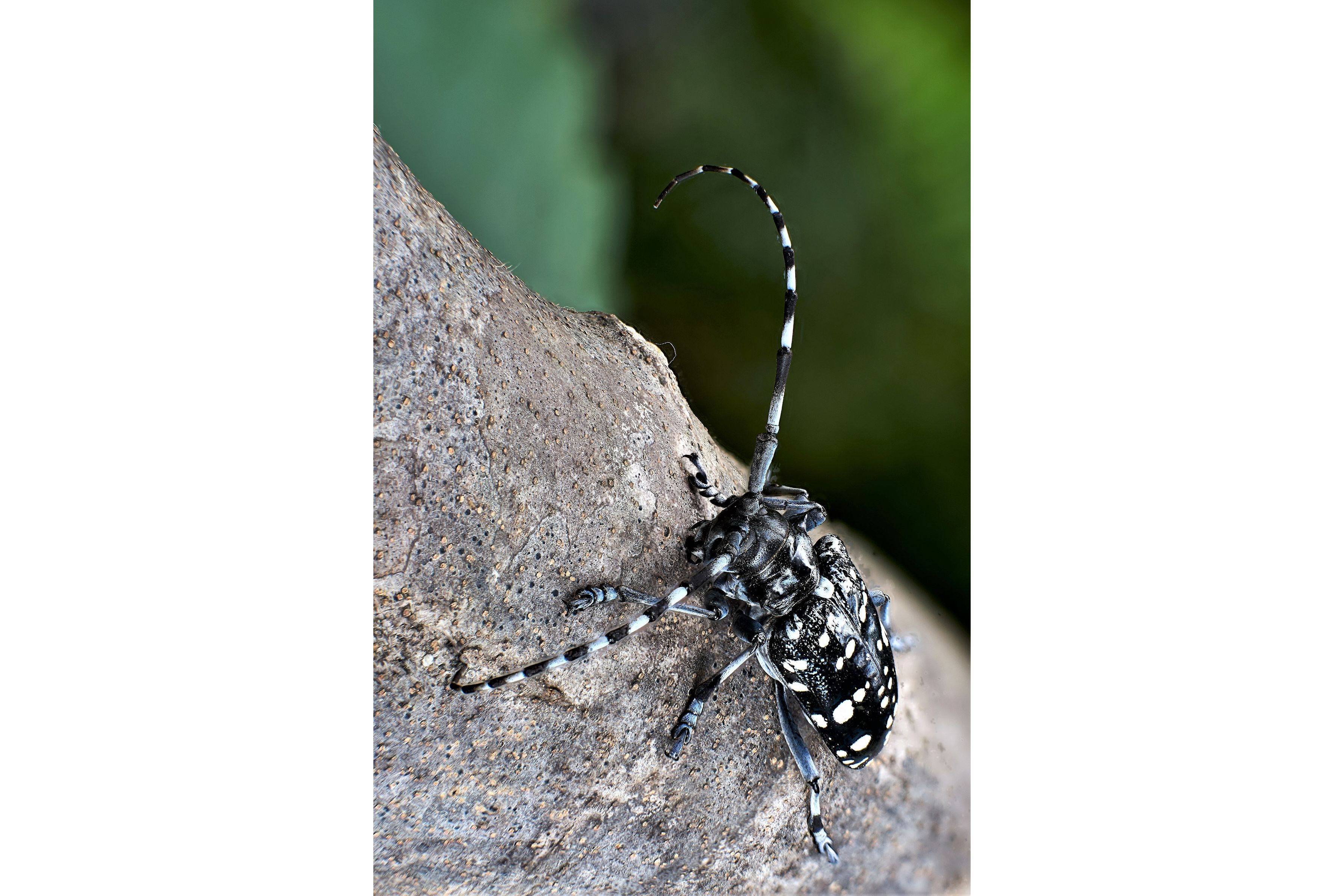 カミキリムシは嫌いです。何度泣かされたことか。6月下旬に捕獲した3匹のうちの1匹。木にとまっているていですが、実はお亡くなりになっています。15枚深度合成。