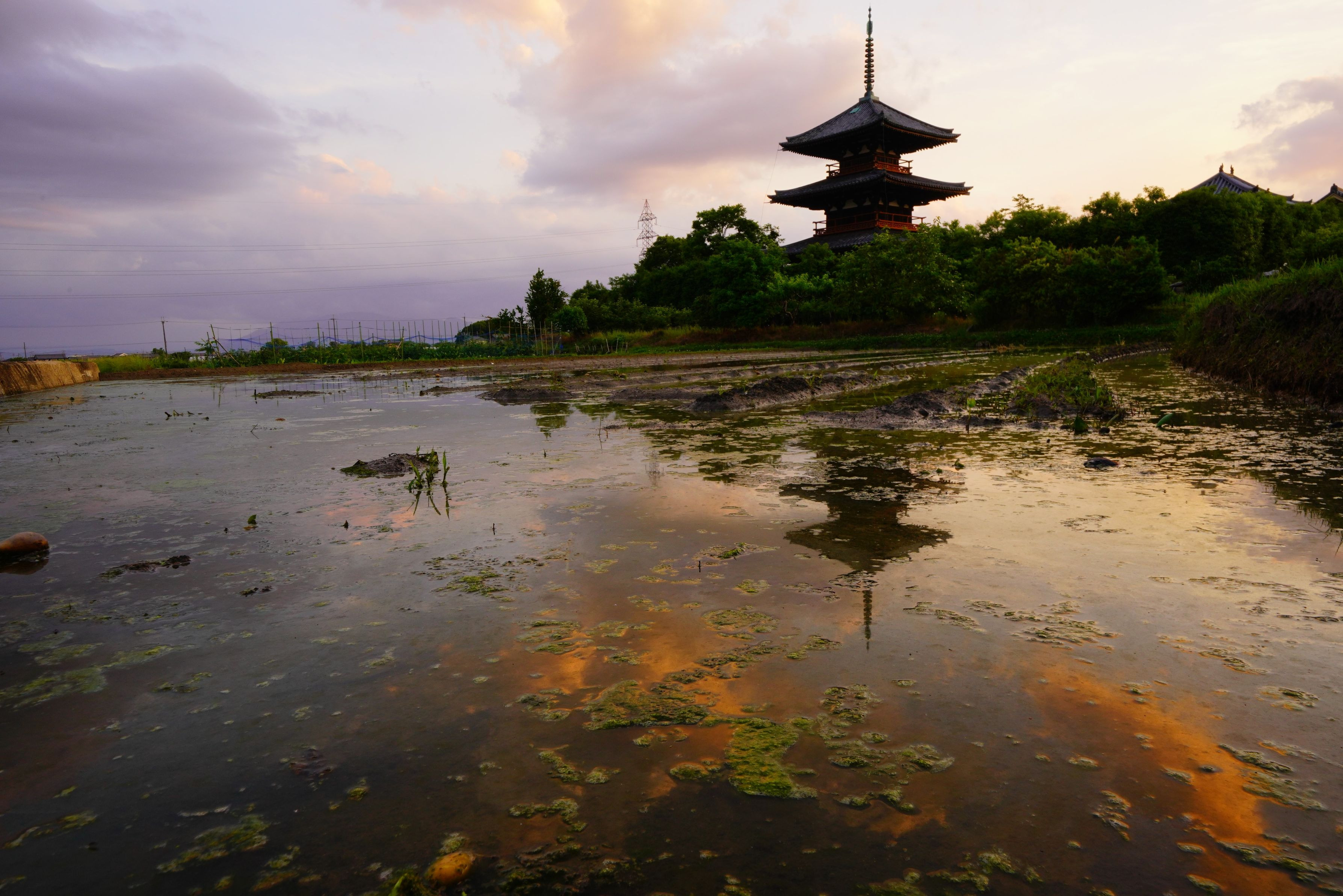 奈良県斑鳩町の法起寺です。ただの田植え前の夕暮れ時です。