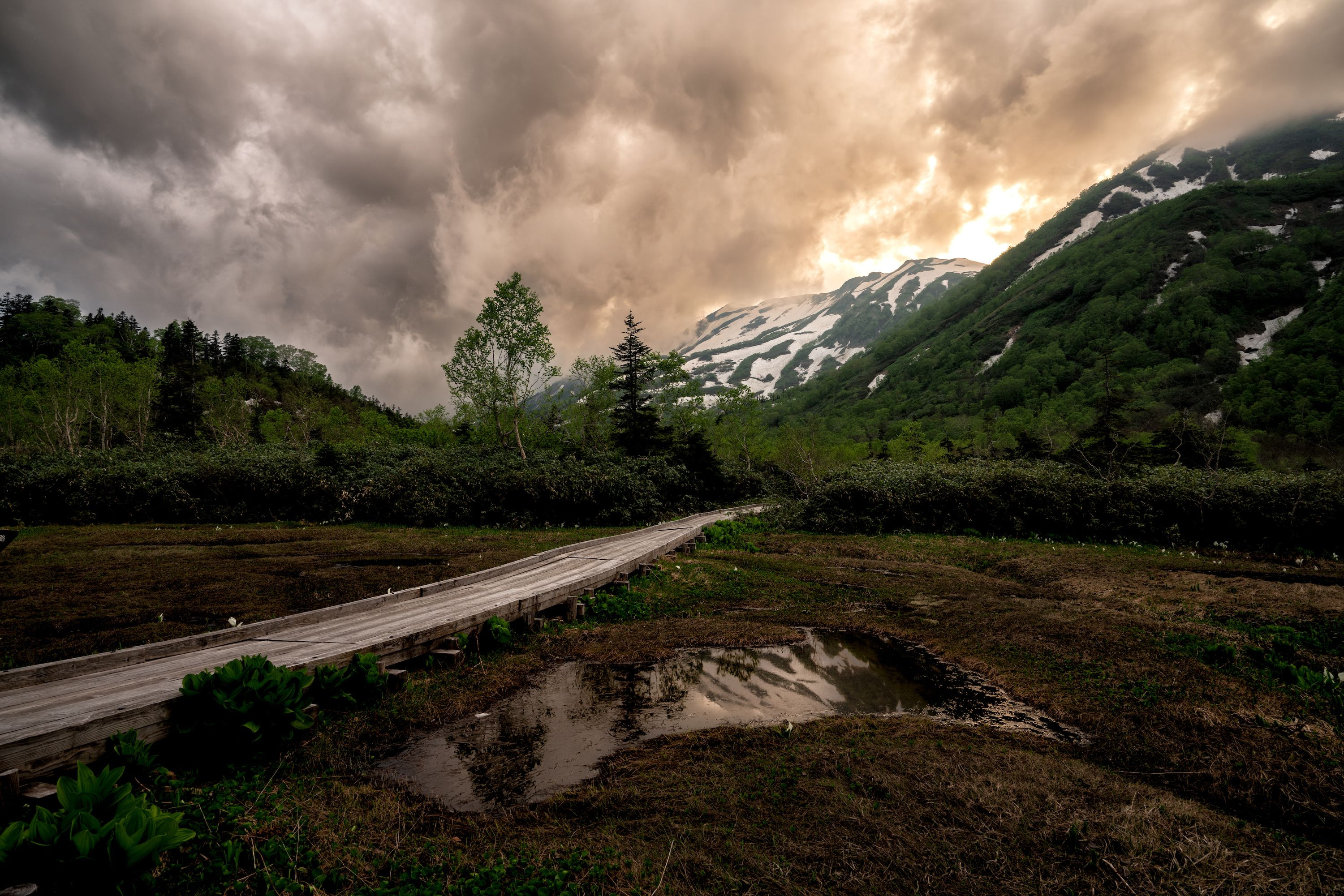 白馬連山にかかった雲が夕日に染まった印象的な夕景でした。久しぶりに見た標高の高い夕暮れに見惚れました。 Location 栂池自然園・長野県