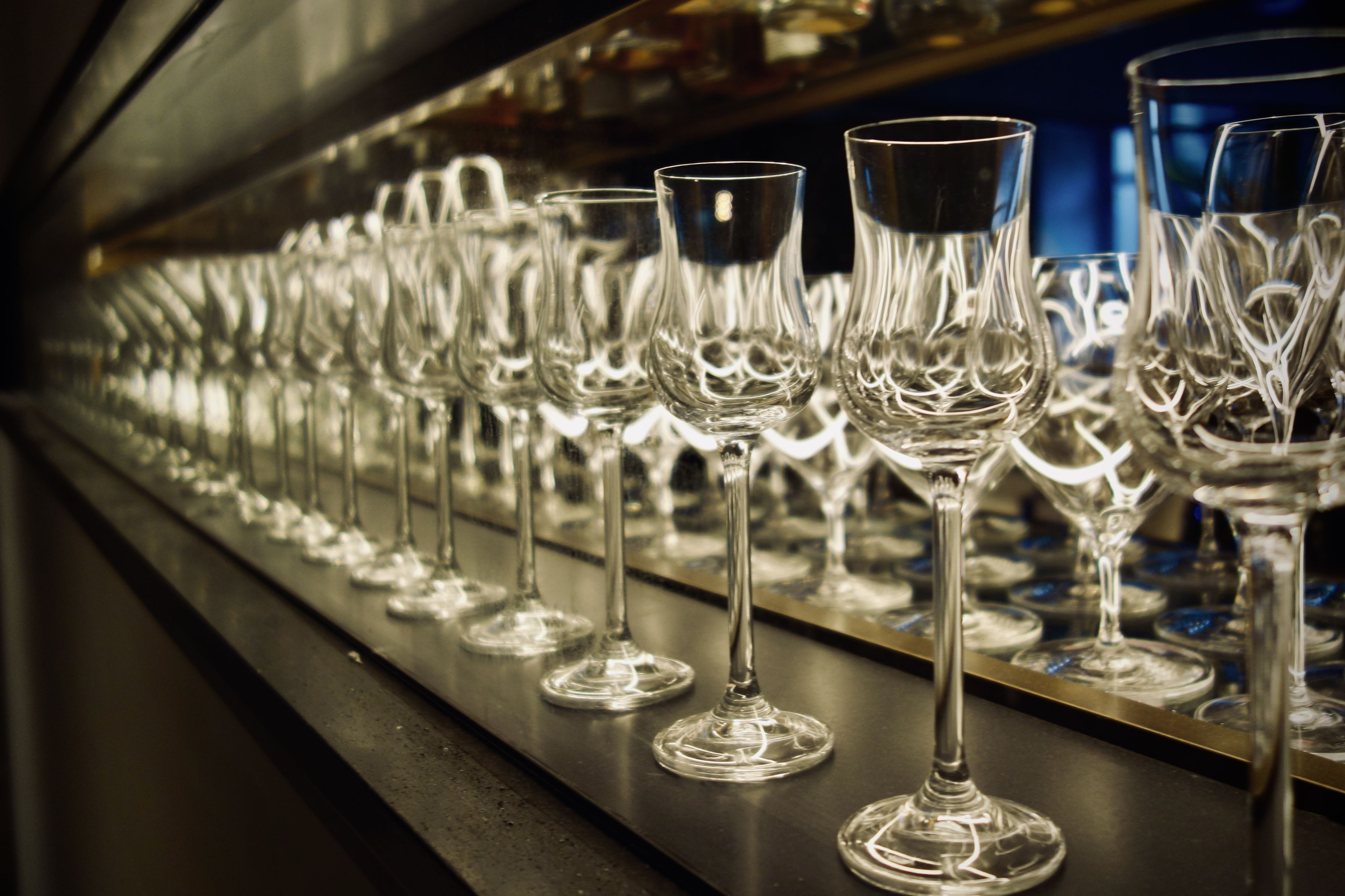整列したワイングラスの複雑な光のシルエット