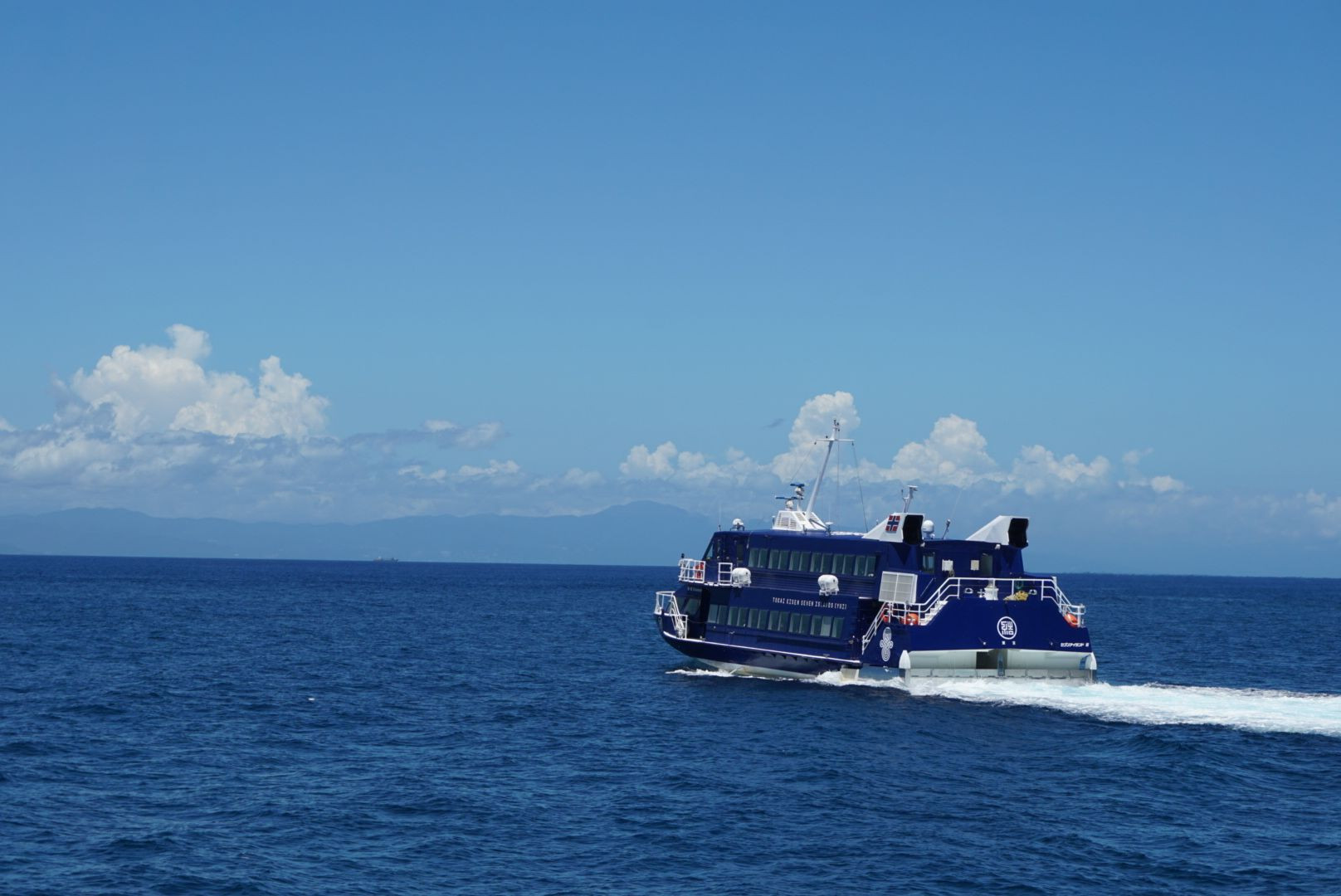伊豆大島の港で撮影。 たくさんの人の想いも載せて出港です。