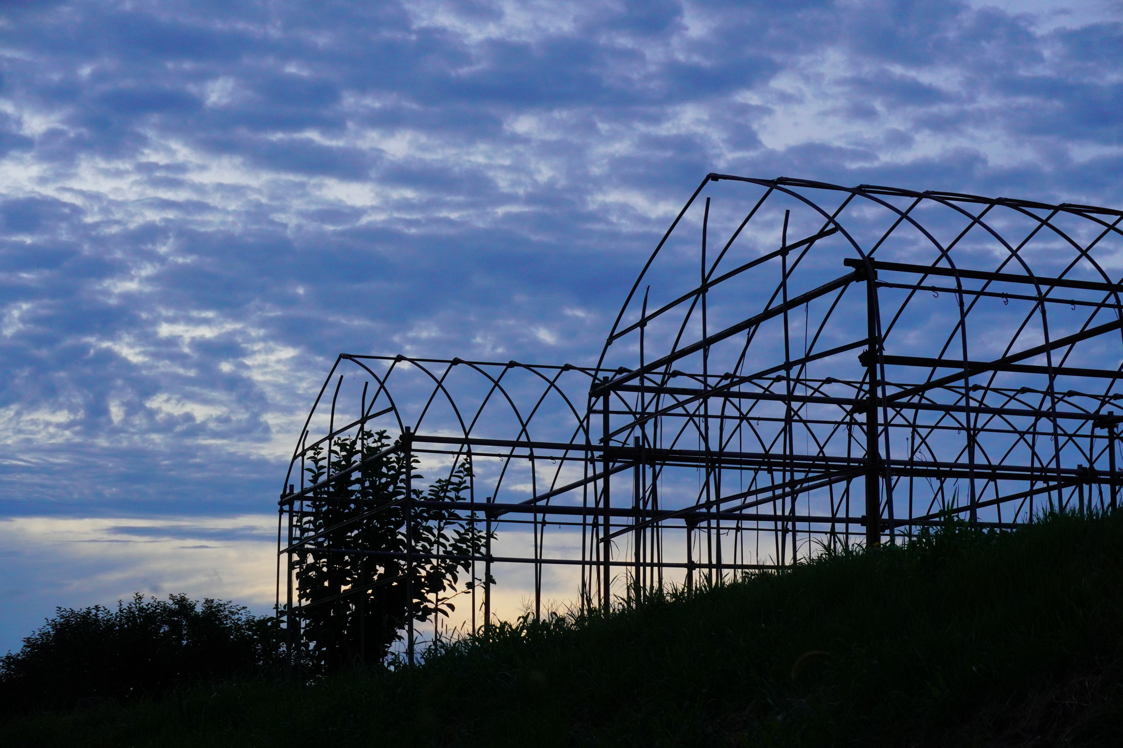 暗くなってきた頃に、ビニールハウスの骨組みを空を背景にして撮りました。