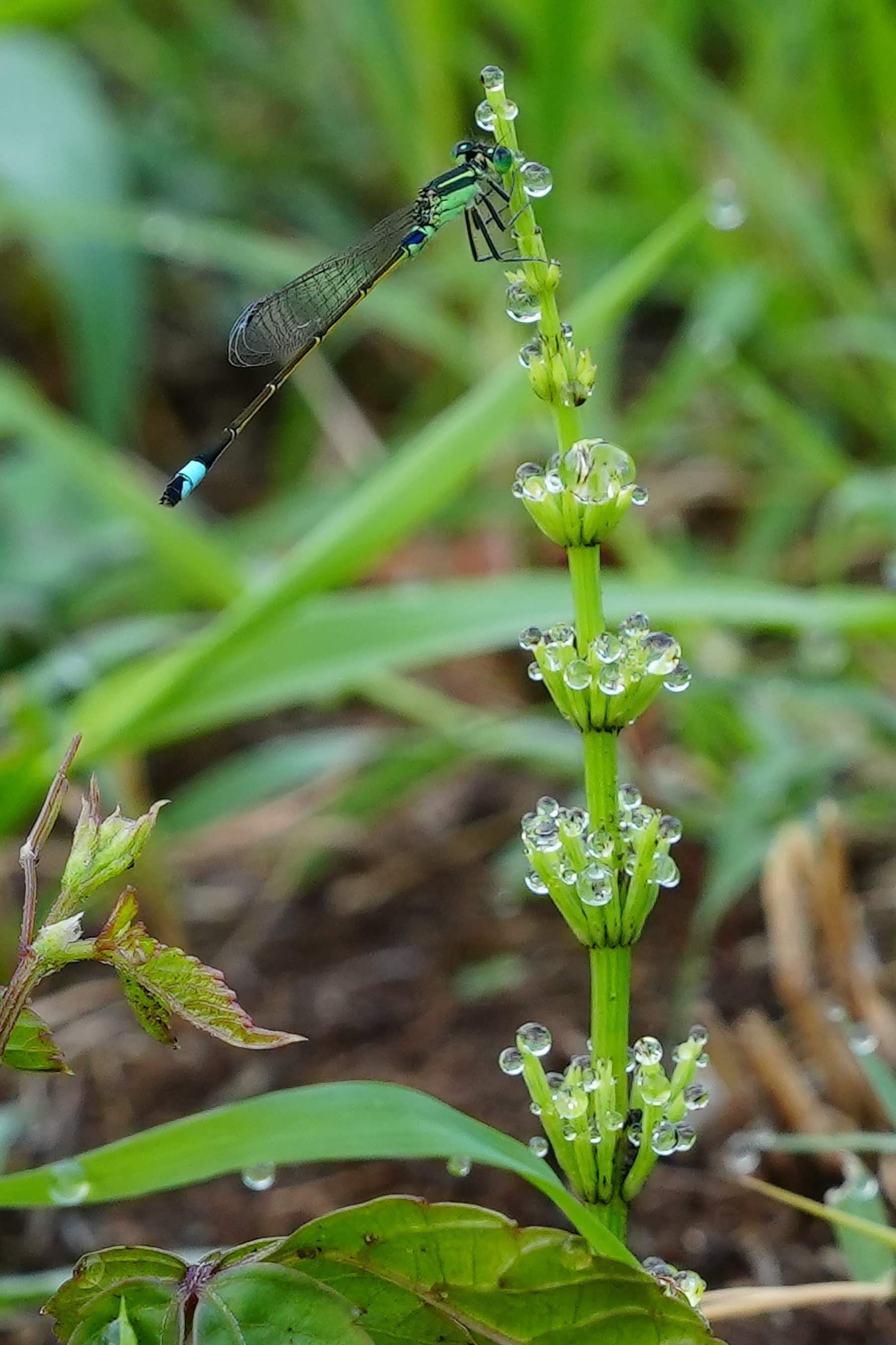 朝露を一杯貯め込んだスギナにアオモンイトトンボが涼しげにご休憩