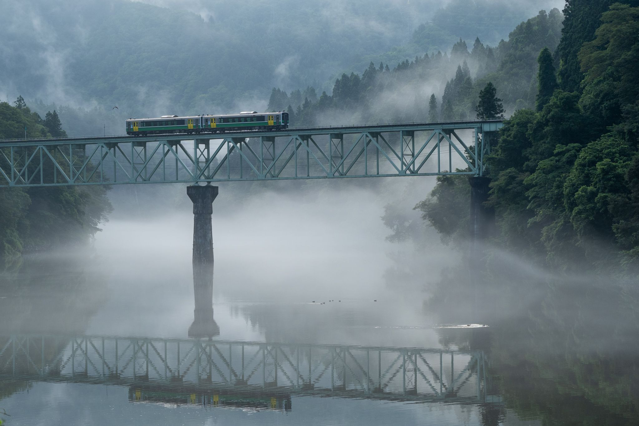 霧と穏やかな川面が幻想的な風景を創り出します